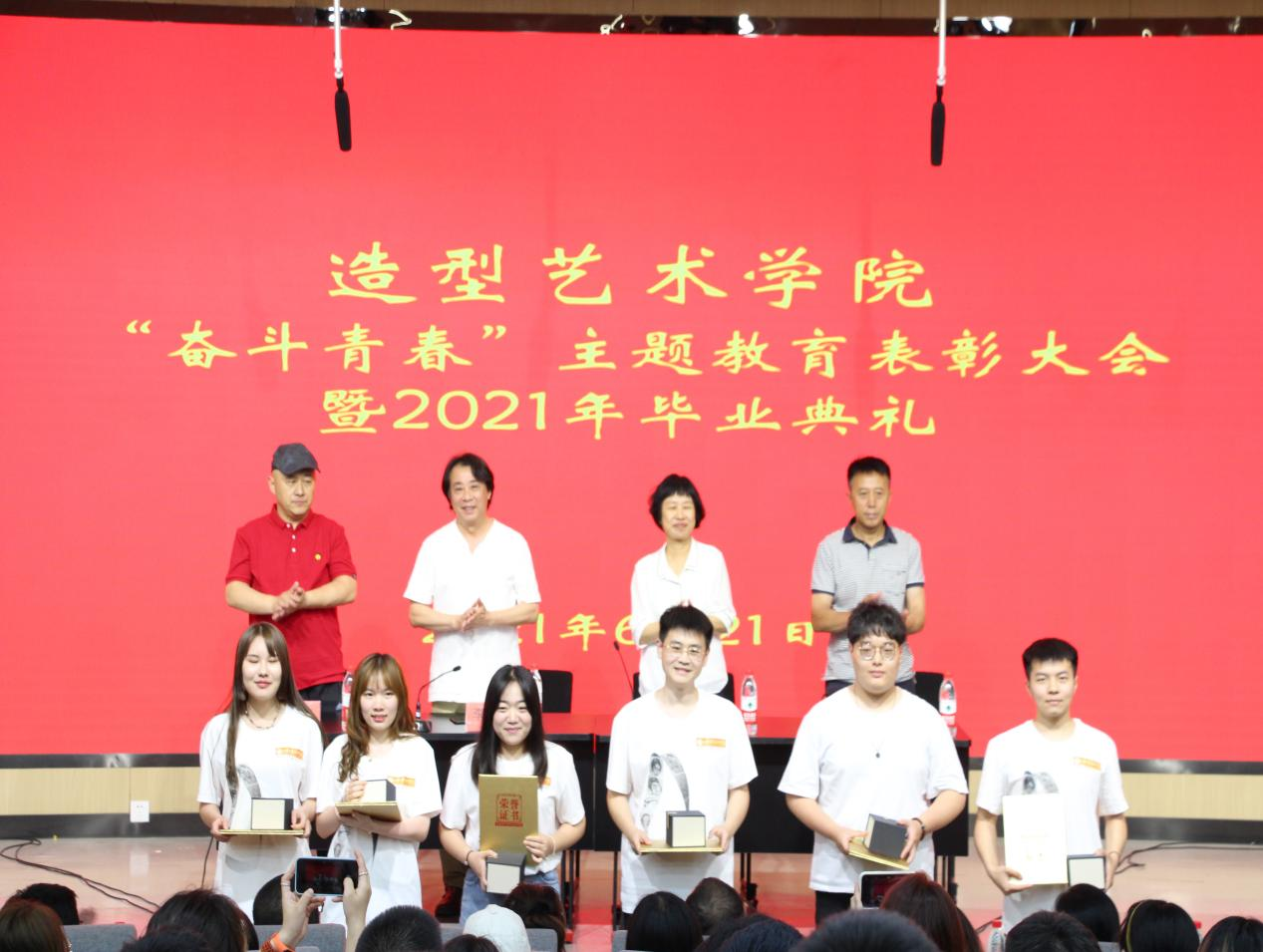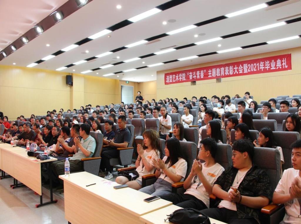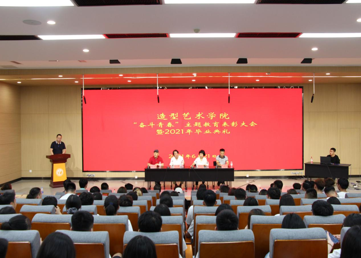 造型艺术学院在2021届毕业生中开展以“奋斗青春”为中心内容的毕业生教育,在常规教育的同时,融入实践教育内容,增强毕业生的责任感。主题教育中,造型毕业生展现出新时代大学生以家国担当为己任的良好精神风貌。为致敬党的百年华诞,表彰先进,同时培养毕业生荣校爱校意识,祝贺同学们顺利完成学业,6月21日下午,造型艺术学院于长清校区阶梯教室举办“奋斗青春”主题教育表彰大会暨2021年毕业典礼,学院领导班子、专业课教师及行政人员、学院全体2021届毕业生参加本次会议,会议由毕业班辅导员许威治主持。