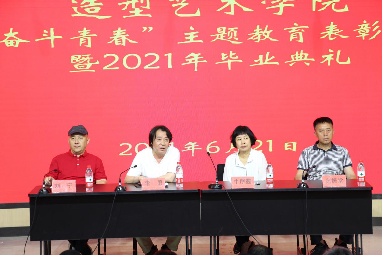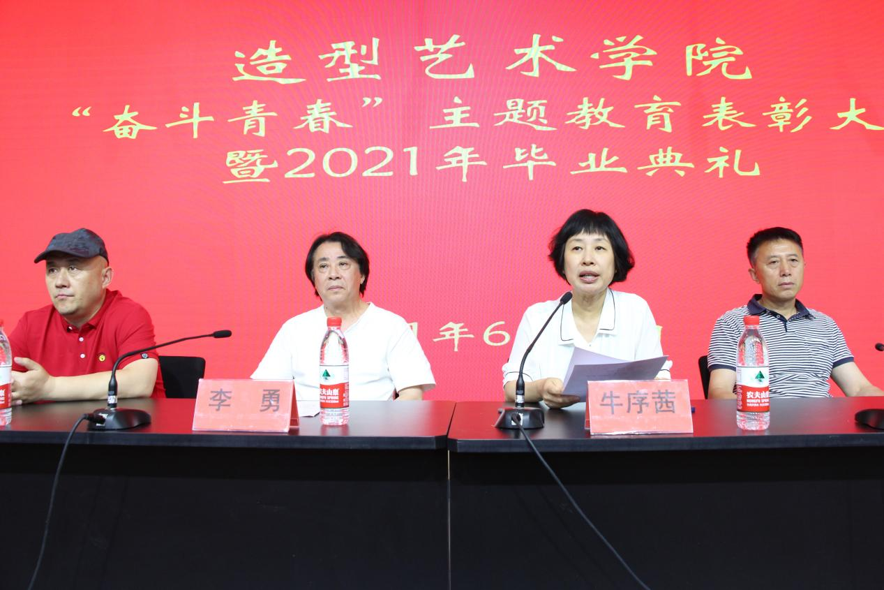 会上,造型艺术学院党总支书记牛序茜宣读了《造型艺术学院关于表彰2021届毕业生“奋斗青春”先进个人的决定》,并号召全体毕业生向受到表彰的同学学习,鼓励毕业生志存高远、敢为人先,勇于担当、砥砺前行,希望学子们不畏艰难,勿忘时代使命,在奋斗拼搏中展现昂扬向上的青春姿态,历练成为新时代中国特色社会主义建设的合格建设者和可靠接班人。学院领导为受到表彰的23名同学颁发证书和奖品。随后,毕业创作优秀作品获奖者代表上台领取本班获奖证书。毕业生代表蒋晶讲述了2021届毕业生在造型大家庭四年学习生活的蜕变与进步、收获与挫折、经验与教训,成长之路上点点滴滴的汇集,都将成为同学们受用终生的宝贵精神财富,发言中坦露出对学院的不尽感激和诚挚祈愿。教师代表胡雪涛发言,他不仅表达了对毕业生们的衷心祝福和不舍之情,同时希望他们在今后的学习和工作中不断学习、踏实做事、老实做人,铭记学院的教诲和嘱托,在人生崭新的赛道上英姿勃发。最后,造型艺术学院院长李勇讲话,他代表学院衷心祝贺同学们顺利完成大学学业,向为毕业生成长付出辛勤劳动的全院教职员工和家长朋友们致以崇高的敬意。毕业意味着人生新的征程的开始,他希望同学们在未来的日子里,秉承校训精神,脚踏实地、勤勉奋斗,坚守理想、迎接挑战,百炼成钢、成为栋梁之才,担负起对国家、民族和家庭的责任。会后,全体人员在弧形广场进行毕业合影的拍摄。