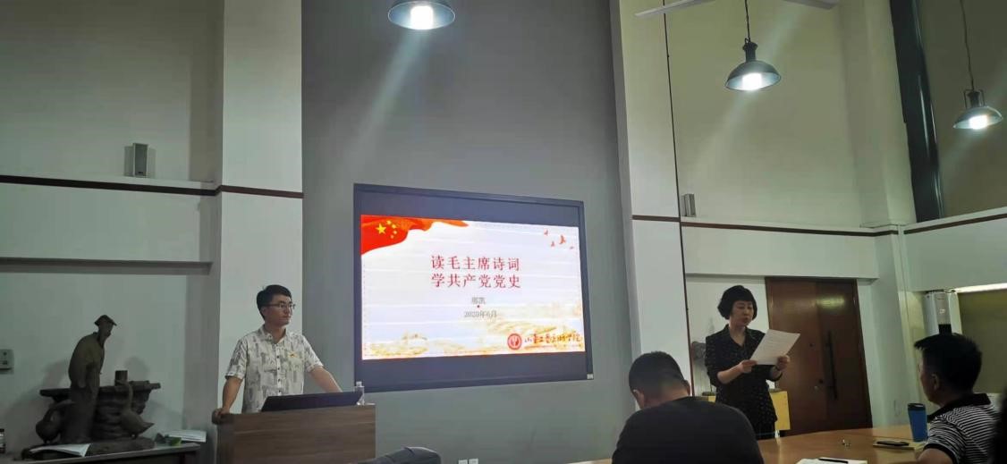 2021年6月22日上午,造型艺术学院四楼多媒体教室,学院全体师生党员听取了学校党史宣讲团成员邢凯老师讲授的党课《读毛泽东诗词 学共产党党史》。党课由造型艺术学院党总支书记牛序茜主持。牛序茜介绍了学校党史宣讲活动的要求,对党课宣讲人、思想政治理论课教学部邢凯老师进行了介绍。