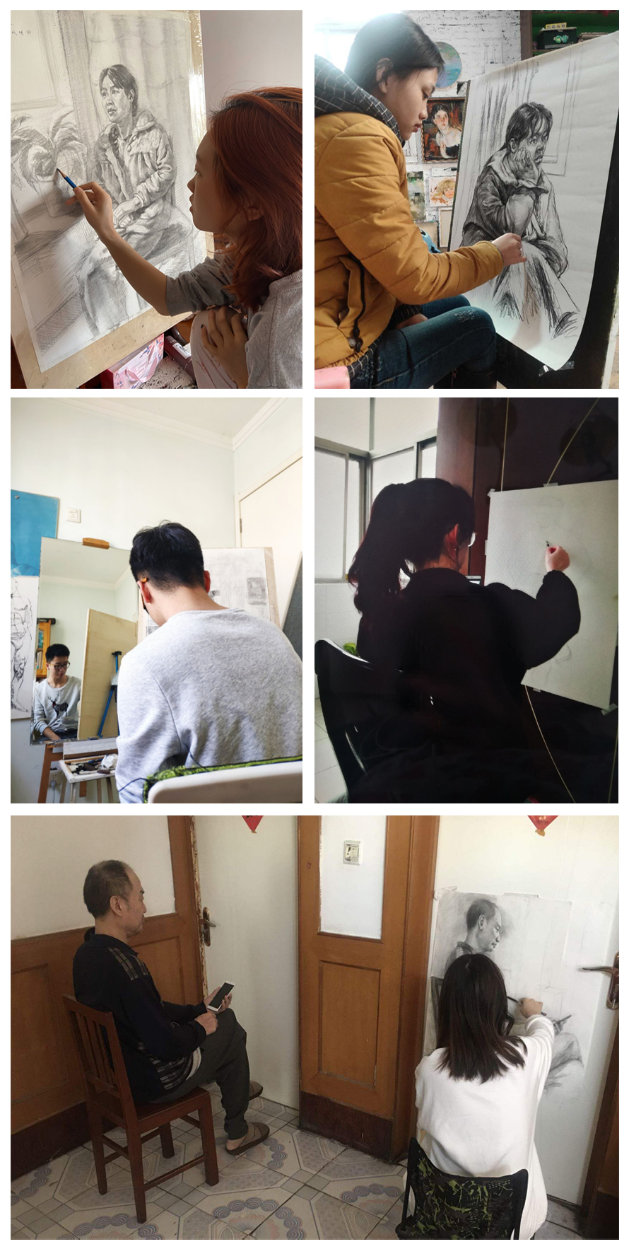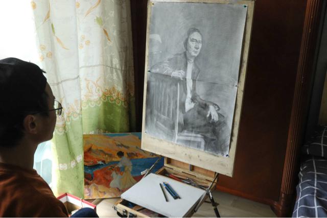 作为一名老教师,因受疫情影响,线上教学还是头一次碰上,为适应线上教学形式的特殊性,在不改变教学计划的前提下,邀请学生的家人参与到教学活动中,积极打造家庭画室。线上实时引导学生居家对模特摆位及环境布置进行指导和交流。以家人为模特的写生方式,既有效监督了学生的学习质量又拉近了师生与家长的距离。学生居家学习,拥有个人独立的作画空间和思考空间,学习环境轻松愉快,学习主观能动性得以充分发挥,能够有效培养学生自主学习的能力。最近,随着疫情的好转,家人开始陆续复工,后期的课程需要及时调整教学思路,要求学生以个人为模特进行自画像写生实践,确保每位学生达到教学大纲基本要求,掌握扎实的造型基本功,保质保量完成教学任务。