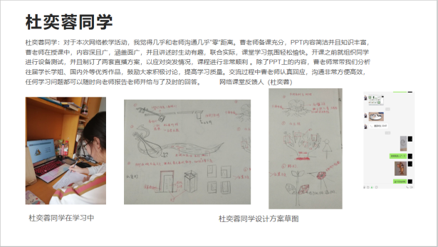在线教学中不乏让人愉悦与感动的时刻。有同学们的上课热情。有家人模特参与到教学活动中,互动交流拉近了师、生与家长距离。有同学在学习了老师推送的电子书等网络资源后,主动向老师发送了自己的读书笔记。还有杨蕙清同学,因为家在山区,手机信号很差,无法在室内接收,一直坚持在寒冷的室外进行网上听课。