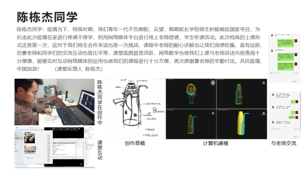转眼这已经是线上课程学习的第三周了,几周课程下来,对于环境雕塑我有了更深入的了解,在学习过程中老师教案准备充分,,精心给我们准备了PPT课件,用心给我们审阅在课下制作的稿件,逐一给我们讲解所制作稿件的优点与不足。同学们在线上也积极的互动,这让我感受到如同在校一般的学习氛围。在制作雕塑上,虽然脱离了教室里的材料与工具,但大家积极的去学习和使用3D建模软件和制图软件,这也让我们脱离了传统材料的束缚。在面对逆境时,大家并没有气馁,而是以积极的心态去解决问题。希望疫情早点结束,回学校和同学们一起学习,感受学校大家庭的温暖。感谢老师-您辛苦了!!