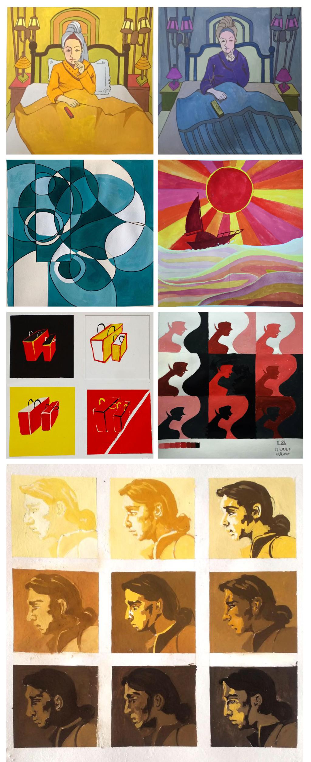 色彩构成是设计造型基础课,构成的学习对于学生认识设计形式的内在规律,掌握视觉形式的创造方法都有帮助。但是对于学生来说,色彩构成理论的学习相对枯燥,为了提高学生的学习积极性,并帮助学生更好的吸收、理解所学的理论知识,我把课程内容分为5个单元,并平均分配在四周课时里讲授。在每次上课之前,都会提前在微信群里发送与即将讲授的内容相关的知识链接、文章推送,保证学生在课前的预习。理论讲授完成后,通过给学生布置实践作业,让学生更好的理解所讲内容。课下,让学生整理课堂笔记,并上传至微信群。实践作业在完成的过程中,学生可以随时在微信上和我沟通交流。