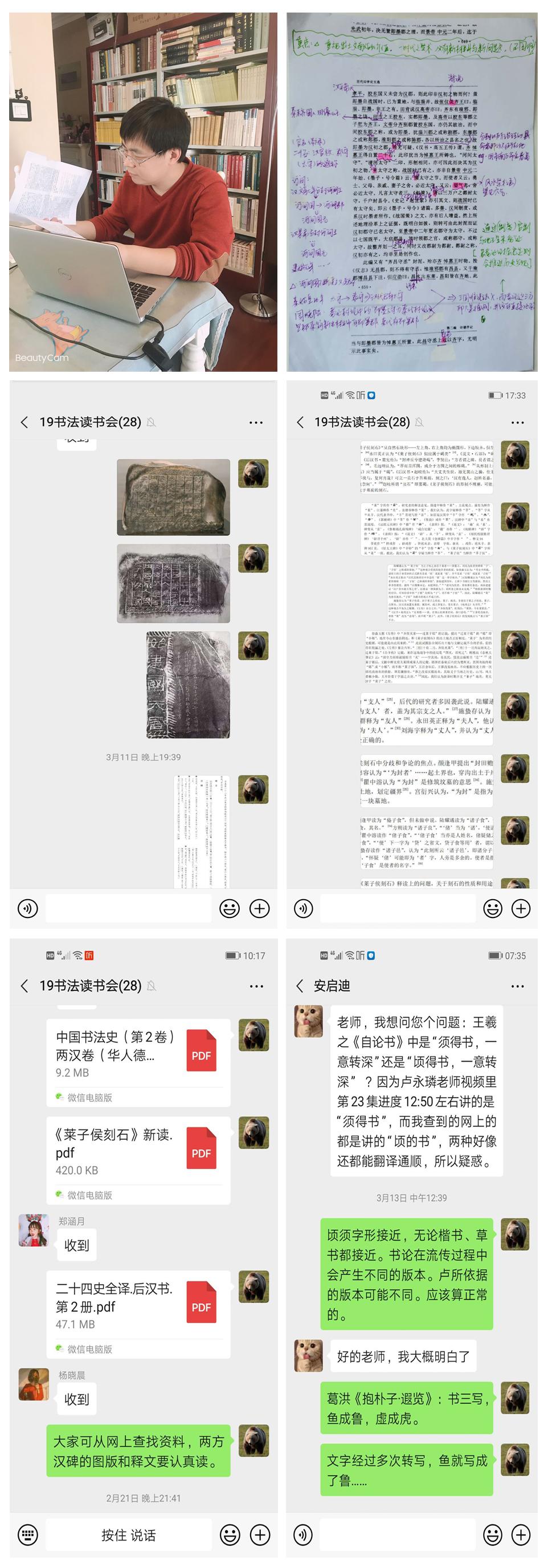 我在聊城老家接受学校开设的线上的课程学习,这门课的内容十分丰富,我感觉受益很多。上课之前,老师要求我们认真看他发的电子书、碑刻图片、释文、还有老师的文章。他强调学习书法一定不要局限在书法本身上,要学习碑刻、文字学、文献学、金石学、考古学等方面的知识。我认为老师的教学方式挺好,扩展我的思路,开阔了我的的眼界。网络课堂相比于传统的讲述式教学有一定的优势,首先是学生去预习,其次是老师耐心讲解,这样才能引起真正的研究兴趣。上课过程中出现网络卡顿,但大家都积极克服困难,投入听课和讨论中。相信在接下来的学习中,我们一定会继续保持良好的学习状态,让自己有所收获!