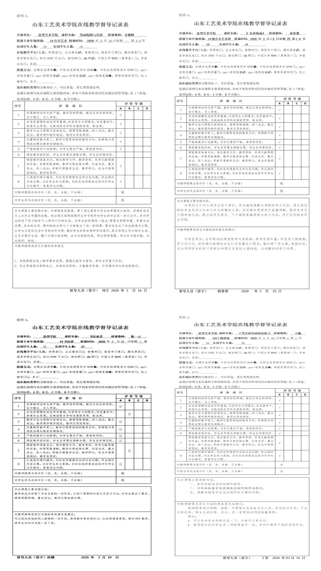 为扎实推进线上教学,遵循“标准不降、形式多样、方式灵活、强调效果、保证质量”的原则,自开学之日起,由院领导、教授、教研室主任、教学秘书组成督导小组,,全面参与质量监控,准确分析质量数据,及时反馈质量信息,本周线上听课7,督查线上教学的进度、内容、效果和质量,及时收集能反映教学质量的信息,与授课老师及时沟通交流,并将自己的丰富教学经验分享给年轻老师,有力的推动教学工作的进行。线上课堂多采用启发式教学,活跃课堂的气氛,增强学生参与感,全面掌握教学活动开展情况。“非常时期”的“非常课堂”期待同学们拿出好的作品,期待线上教学取得优异成绩。