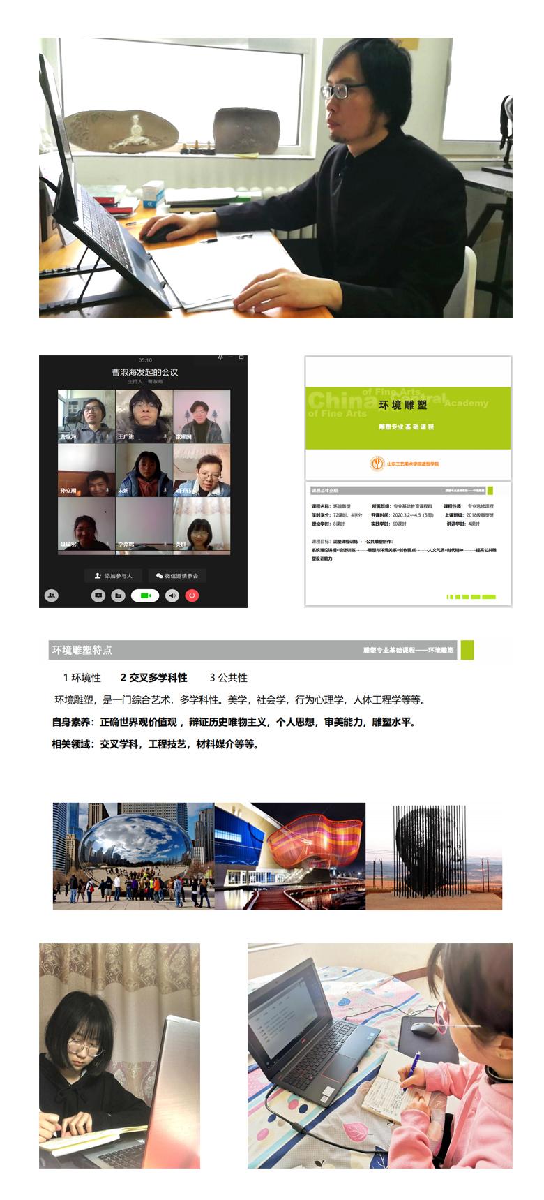 曹淑海老师与学生在课前进行过深入交流,学生对相关课程内容都进行了充足的预习并准备积累了大量相关资料,便于网络课堂交流研讨。课程理论知识准备充分,重点讲述了环境雕塑的历史沿革、环境雕塑与环境的关系及相互作用、环境雕塑设计要点及相关知识等相关理论知识。以教师点名提问,学生必答方式进入网络课堂,引导学生进入互动交流模式,设置讨论环节,在探讨中将相关知识点授与学生并引发学生思考问题、解决问题的同时,很好地确保每位同学在课程内容学习过程中的专注力。将课堂教学与学院精神结合起来,和社会热点结合起来,将课堂内容与时代精神结合,布置作业特别强调要与抗疫、医疗主题很好结合。曹淑海老师课堂气氛活跃,师生互动良好,学生无迟到、旷课、早退现象,网络畅通正常,课堂反响热烈。