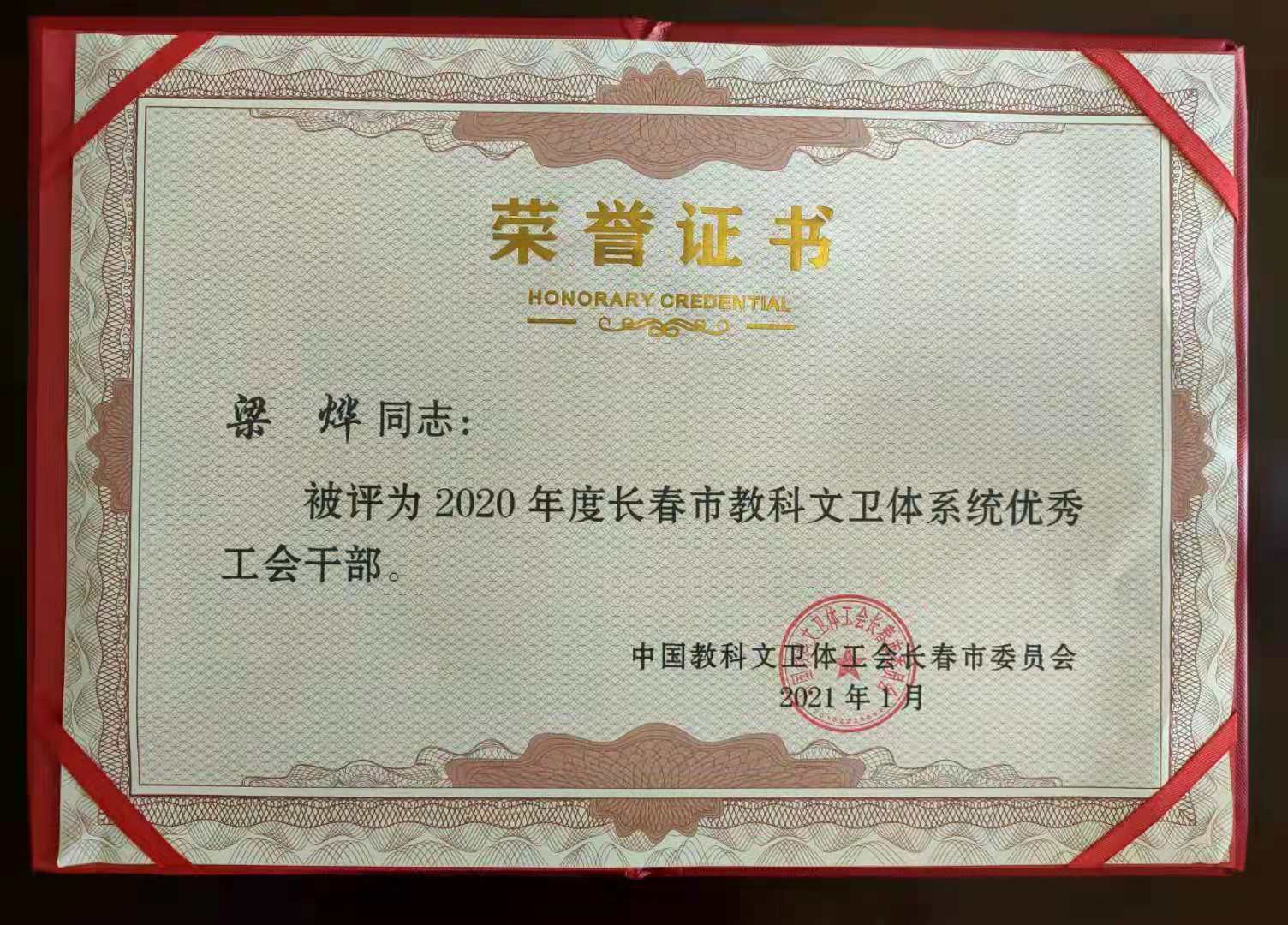 本网讯(校工会 供稿)近日,长春市教科文卫体工会发布了《关于表彰2020年长春市教科文卫体系统先进集体和先进个人的决定》(长会教字[2021]2号),Beat365工会被授予“模范职工之家”称号,管理信息中心分工会被授予“模范职工小家”称号,工会梁烨同志荣获2020年度“优秀工会干部”荣誉称号。