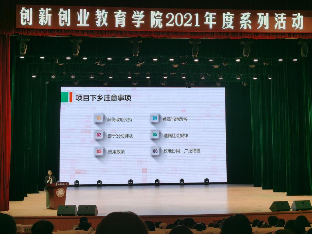 下午,在多功能学术会议中心,崔家红教授为有志于参加“互联网+”大学生创新创业大赛的师生,做了主题为《敢闯会创、书写人生华章、高质量参与全球“双创”盛会》的报告。本次报告主要围绕“互联网+”大赛的组别、项目制作、以及能力要求做了详细说明,为参赛师生指明了方向。(审核人 卞志刚)