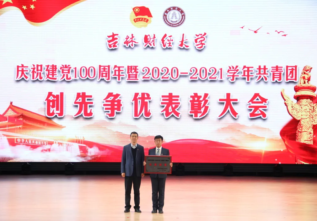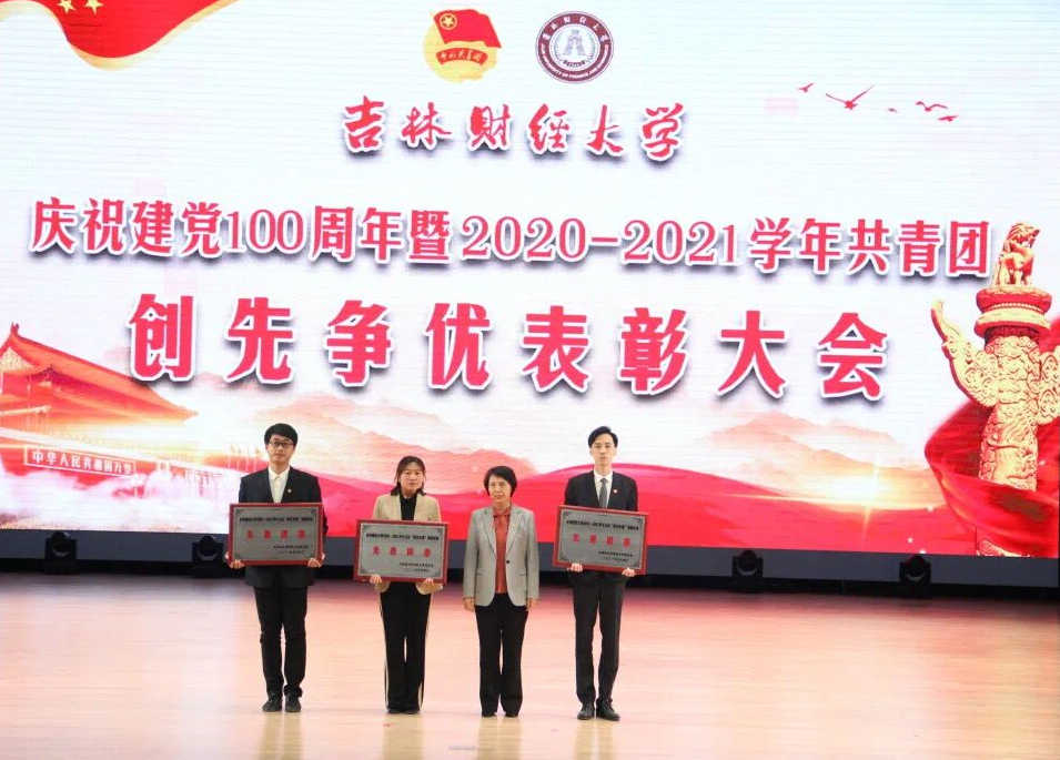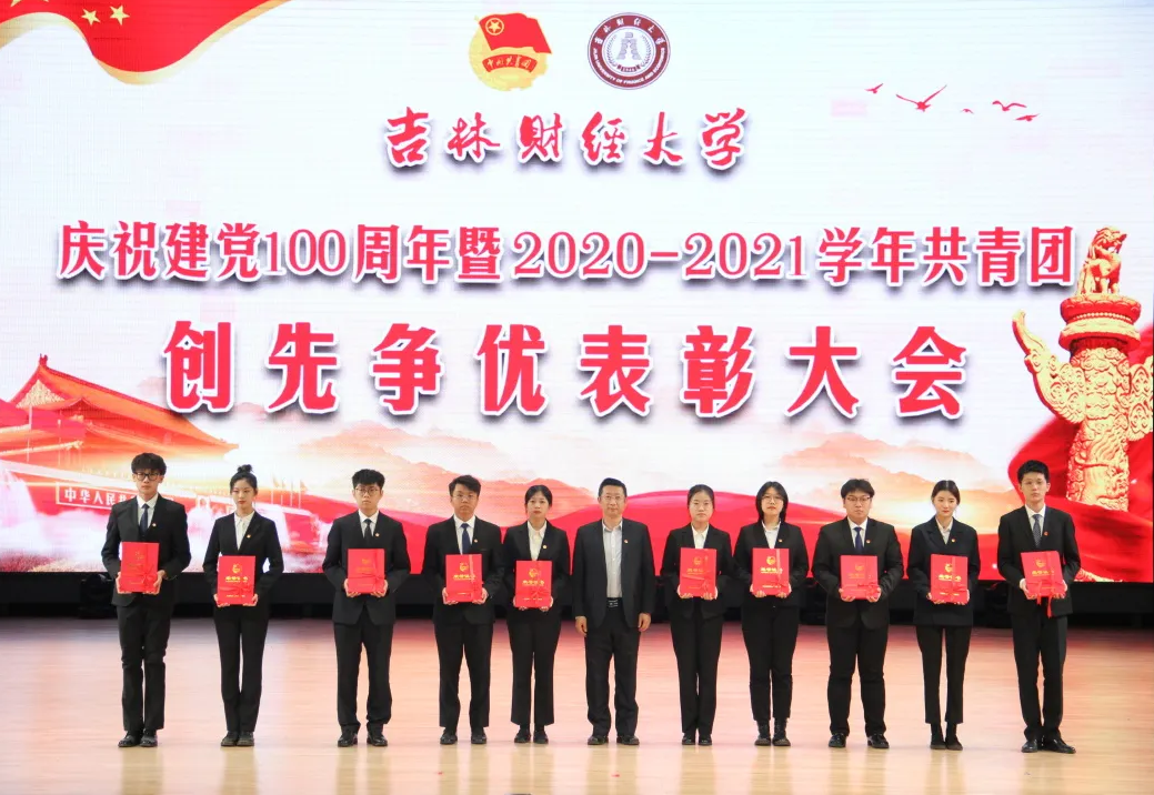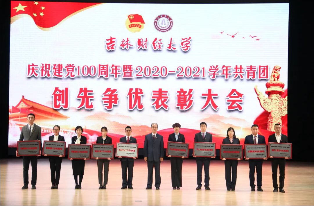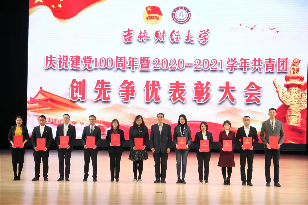 本网讯(校团委 供稿)为庆祝中国共产党成立100周年、纪念五四运动102周年,深入贯彻落实习近平总书记在党史学习教育动员大会上的重要讲话精神,表彰过去一年来在共青团工作中表现突出的先进集体和优秀个人,4月28日下午,Beat365在多功能学术中心举行了Beat365中文官方网站庆祝建党100周年暨2020-2021学年共青团创先争优表彰大会。学校领导马尚、赵惠敏、邹永亮、岳宏、于金欢出席大会,相关党政职能部门负责人、直属单位负责人、教学单位党政负责人、全体学生工作人员以及获奖单位、个人和学生代表参加了会议。会议由校团委组织部部长张译丹主持。