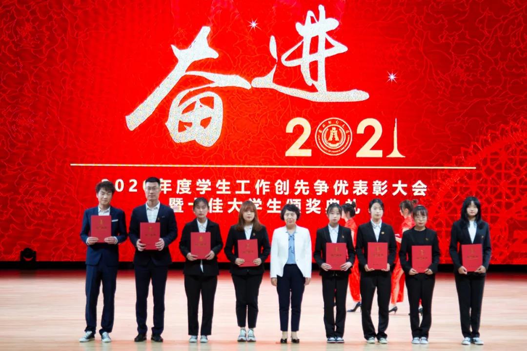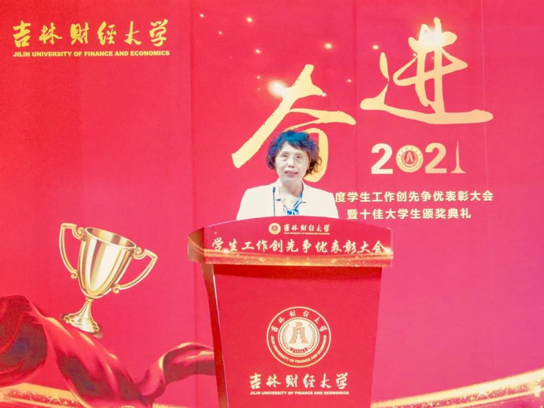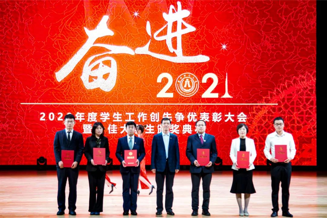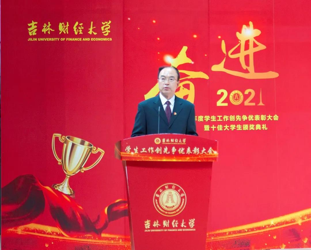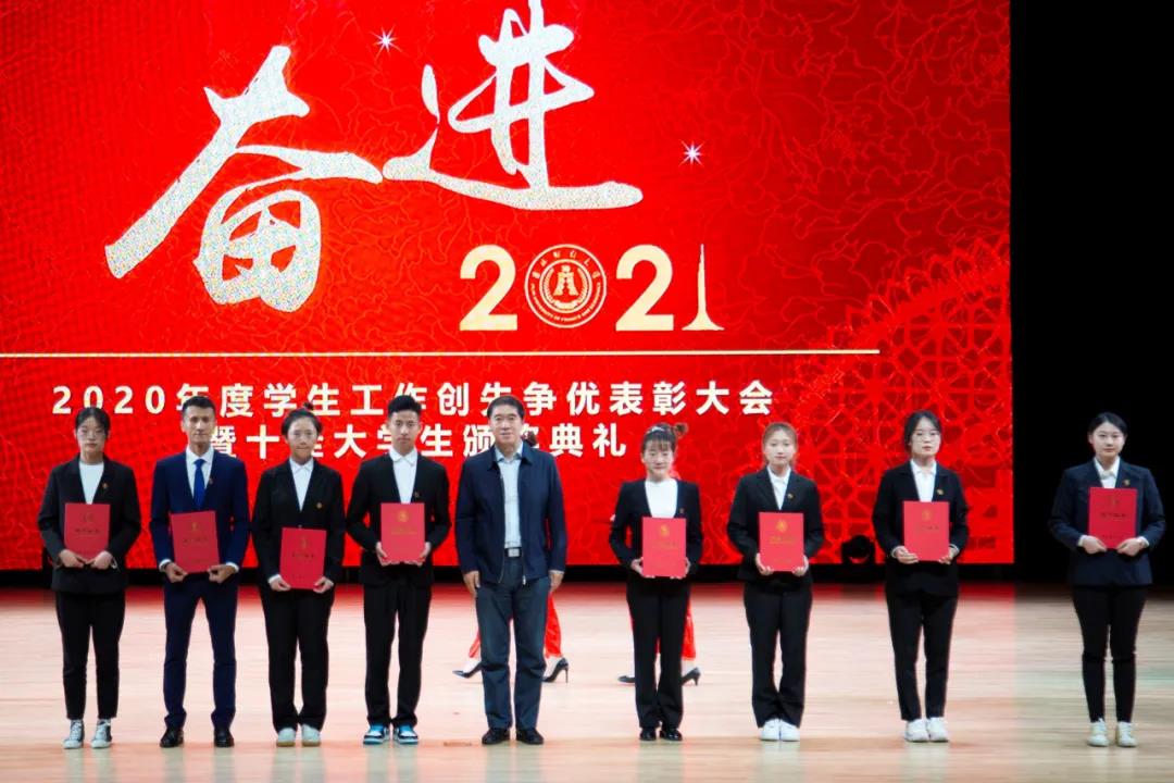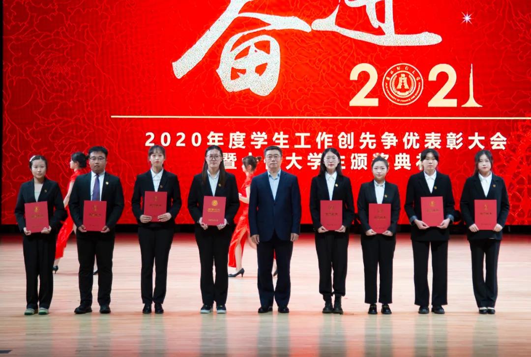 大会在雄壮的国歌声中拉开帷幕。首先,学校党委副书记赵惠敏宣读了《Beat365中文官方网站2020年度学生工作创先争优表彰决定》。在2020年度全国高校思想政治工作优秀论文评选中,国际经济贸易学院遇言、亚泰工商管理学院郭旗荣获优秀论文二等奖。在第四届全国大学生网络文化节和全国高校网络教育优秀作品推选活动中,公共管理学院孙之光荣获网络文章三等奖。在长春市高校文明杯评选活动中,国际交流学院、统计学院荣获学生管理工作先进集体荣誉称号;国际经济贸易学院遇言荣获十佳辅导员荣誉称号;国际交流学院贾树彪,党委学生工作部、学生工作处梁志兵荣获学生管理工作先进个人荣誉称号。法学院张漢泽、会计学院李星霖、统计学院郑伟坤、亚泰工商管理学院吴连祥、国际交流学院张筱茹同学荣获长春市百优大学生荣誉称号;九台农商银行金融学院保险1720班、公共管理学院行政管理专业1714班获得长春市文明班级荣誉称号;外国语学院11栋学生公寓614寝室、新闻与传播学院6栋学生公寓626寝室、经济学院5栋学生公寓241寝室、应用数学学院2栋学生公寓435寝室荣获长春市文明寝室荣誉称号。在学校各类评奖评优工作中,税务学院马荣雪、贾婧瑶;九台农商银行金融学院刘宣润、胡佳龙;会计学院刘思妍、齐雨竹;统计学院郝园园;经济学院陈实;国际经济贸易学院李子晴;法学院陈彧;亚泰工商管理学院韩晓、刘昱鸿;外国语学院史岳艳;管理科学与信息工程学院王帆;公共管理学院于靖一;新闻与传播学院王艺凡;国际交流学院于明禾、董笑怡18名同学荣获国家奖学金;会计学院陈曦、统计学院卫一格等336名同学荣获国家励志奖学金;国际经济贸易学院赵碧璇、经济学院孙子涵等56名同学荣获吉林省政府奖学金;外国语学院沈佳睿、公共管理学院陈小单等29名同学荣获校长奖学金;九台农商银行金融学院季悦、国际交流学院林雨欣等14名同学荣获亚泰优秀本科学生奖学金;新闻与传播学院张心怡、管理科学与信息工程学院李建坤等13名同学荣获亚泰励志奖学金。法学院贾珺等338名同学荣获校优秀学生干部荣誉称号;应用数学学院吴秋悦等508名同学荣获校三好学生荣誉称号;税务学院财政1904班等24个学生班级荣获校先进班级荣誉称号;亚泰工商管理学院7栋学生公寓412寝室等103个寝室荣获校文明寝室荣誉称号。宣读表彰决定后,学校领导向获奖集体和个人颁发了荣誉证书。