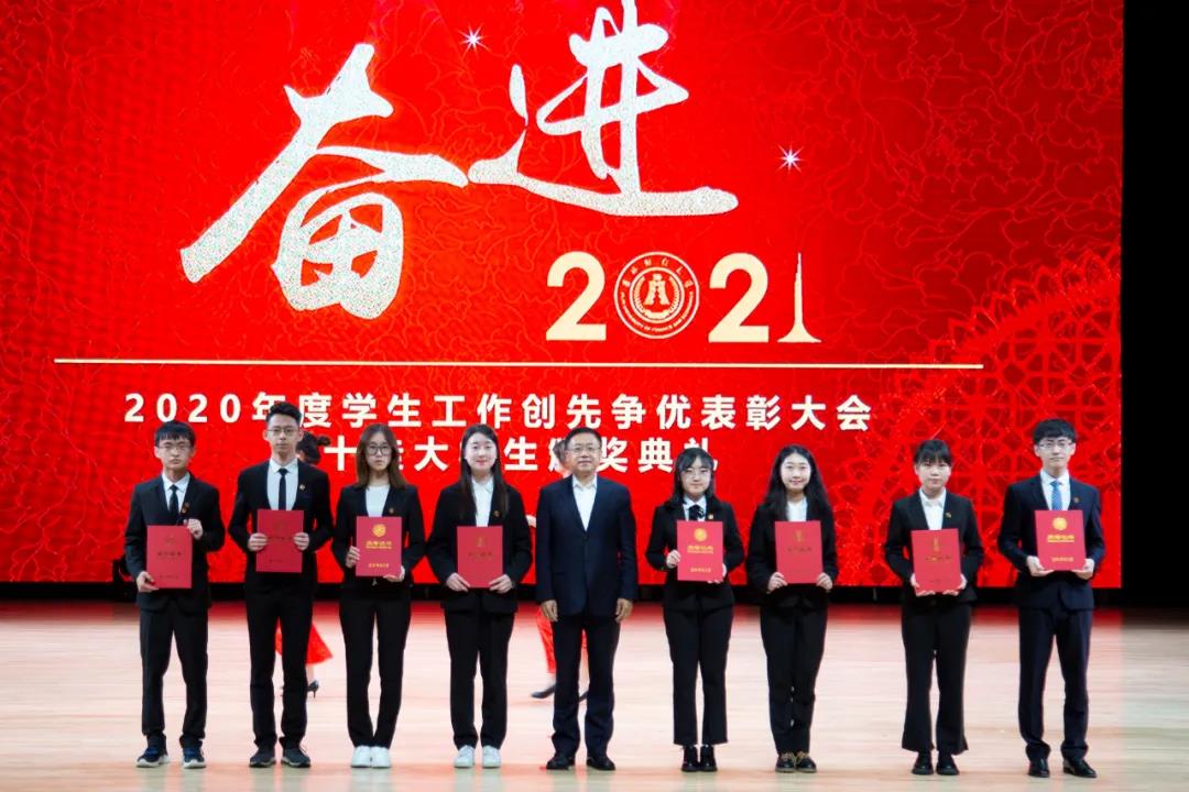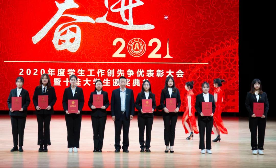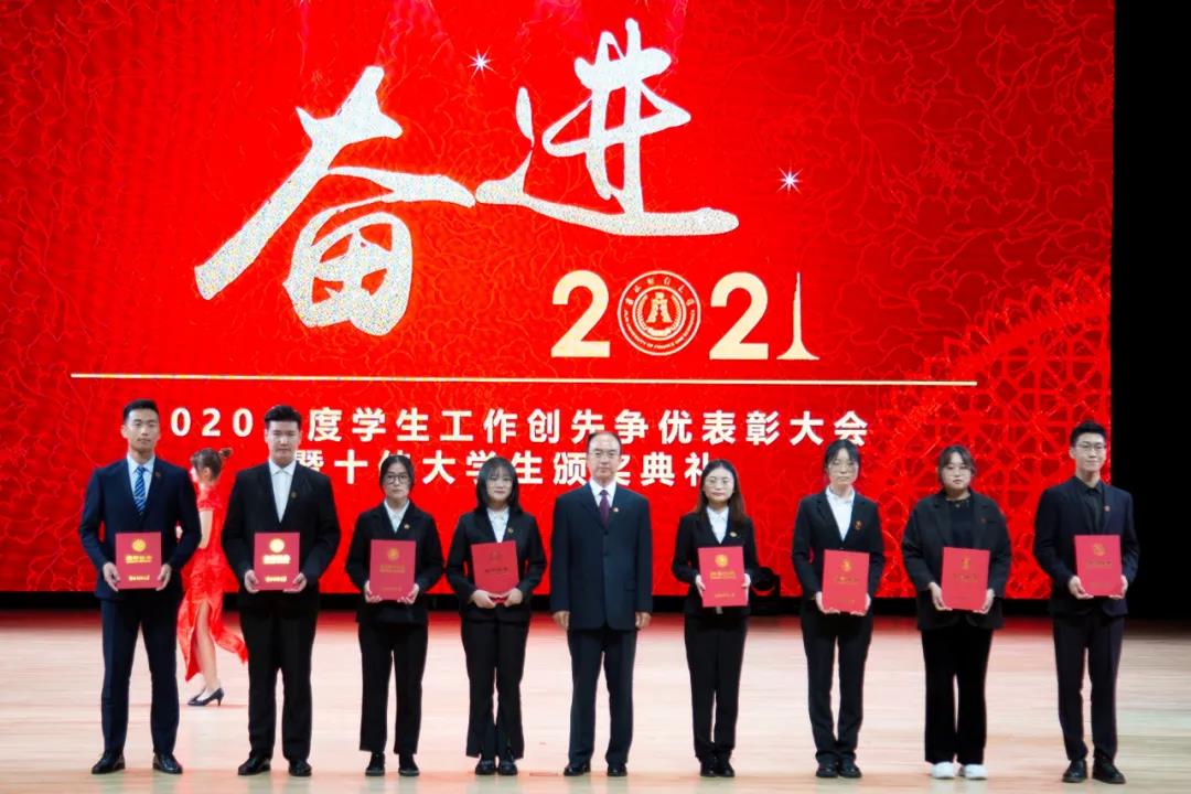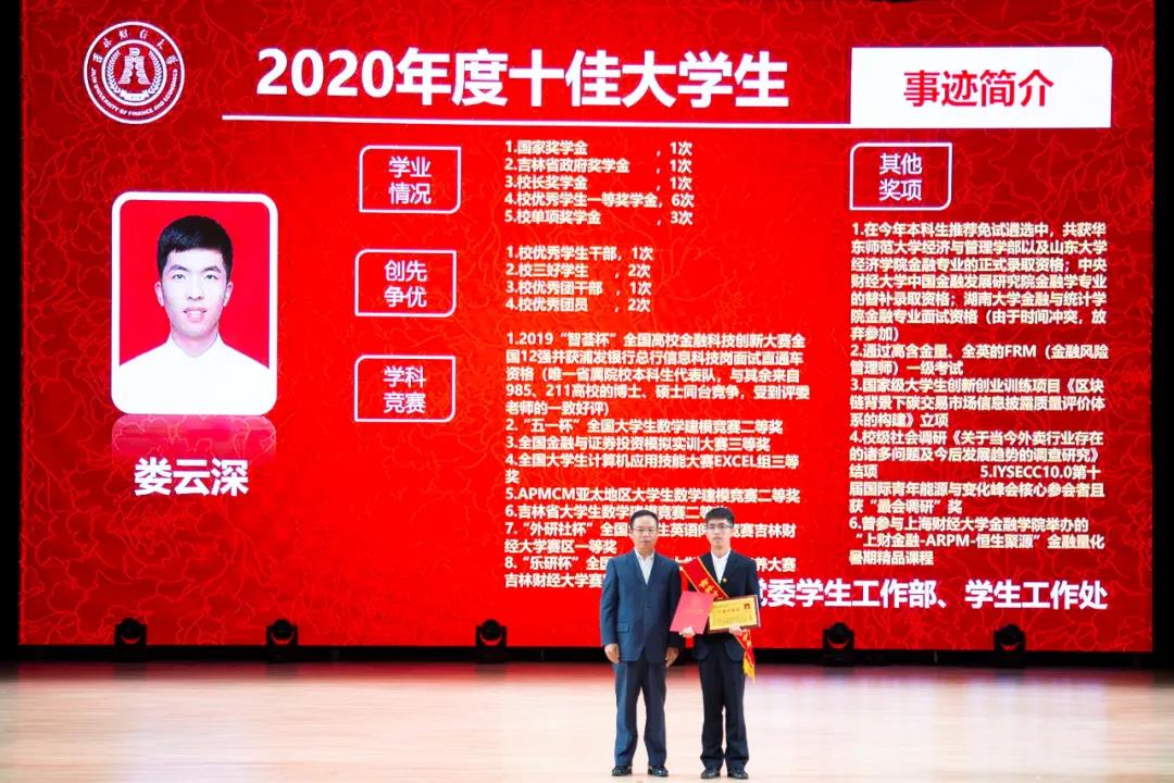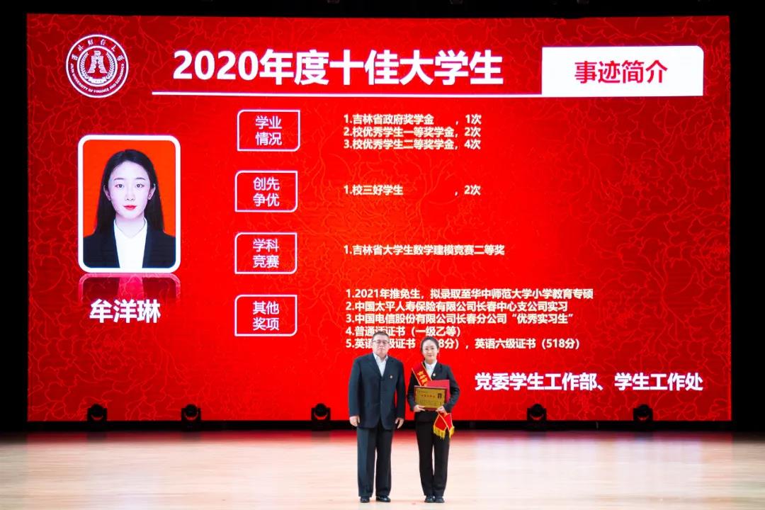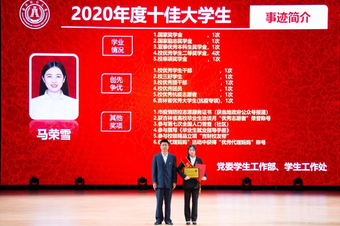 在随后进行的“十佳大学生”颁奖典礼仪式上,统计学院胡悦欣、国际交流学院于明禾、会计学院齐雨竹、应用数学学院牟洋琳、管理科学与信息工程学院毋馨敏、九台农商银行金融学院娄云深、税务学院马荣雪、亚泰工商管理学院王汛、公共管理学院于靖一、亚泰工商管理学院楼大成十名荣获2020年度“十佳大学生”荣誉称号的同学受到了表彰。“十佳大学生”辅导员为他们宣读了颁奖词,各学院党委、党总支书记为本学院“十佳大学生”颁发了奖牌和荣誉证书,获奖学生发表了感言,表达了自己获得这一殊荣的欣喜和对学校培养的感激之情。