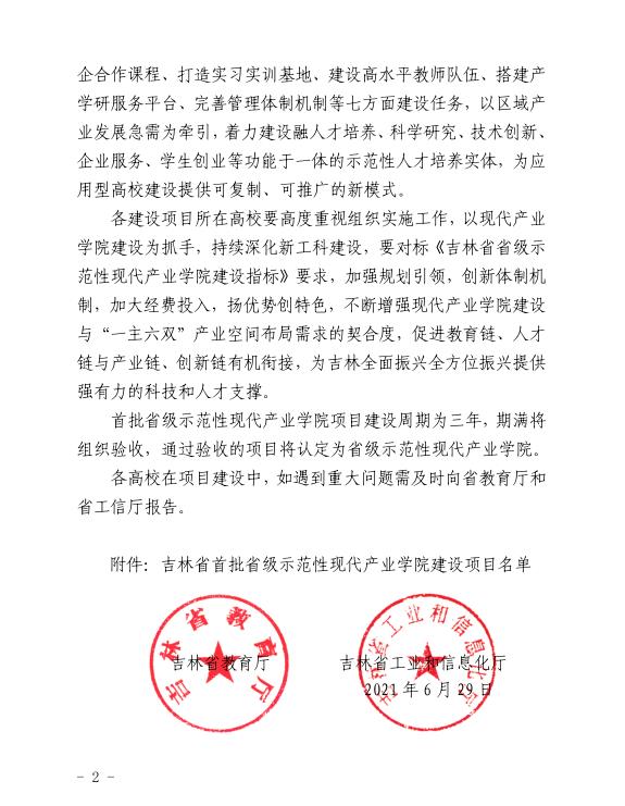 学校将以本次省级示范性现代产业学院建设项目为契机,主动适应国家战略需求,对标《吉林省省级示范性现代产业学院建设指标》要求,创新人才培养模式,提升专业建设质量,开发校企合作课程,打造实习实训基地,建设高水平教师队伍,搭建产学研服务平台,完善管理体制机制,促进教育链、人才链与产业链、创新链有机衔接,为吉林全面振兴全方位振兴提供强有力的科技和人才支撑。(审核人 唐亚晖)