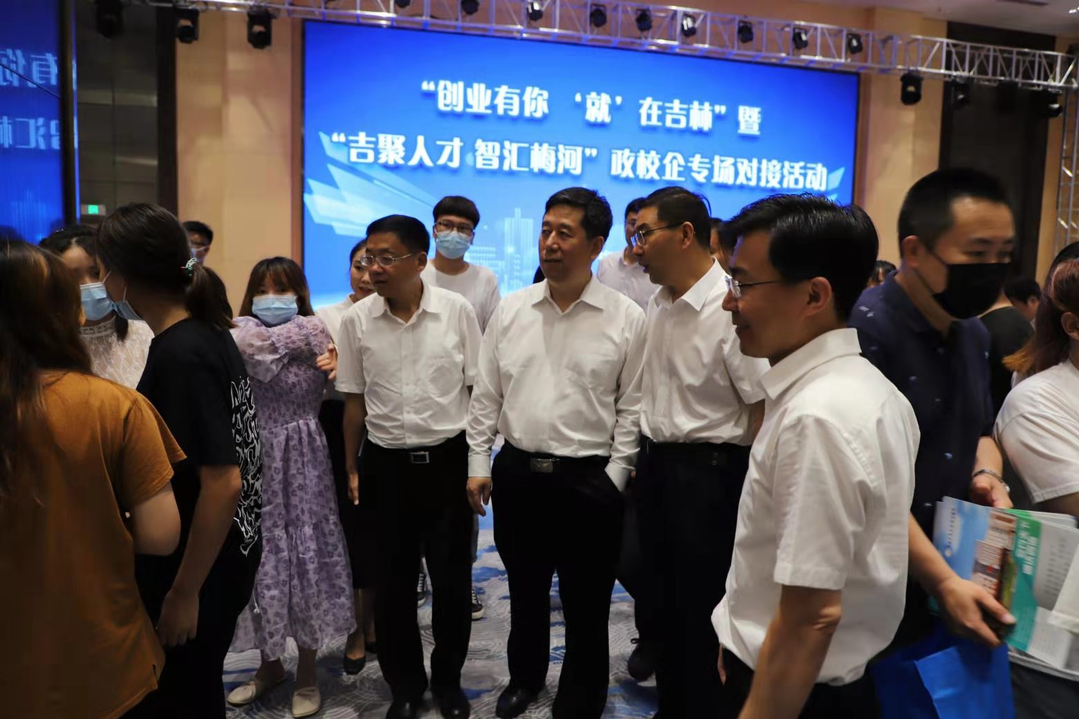 本网讯 (招生就业处 供稿)7月14日,“创业有你‘就’在吉林”暨“吉聚人才 智汇梅河”政校企对接交流活动在梅河口市国际会议会展中心举行。省人社厅副厅长张立福,省政府教育督导委员会总督学岳强,省人才中心副主任郭毅,梅河口市委副书记、市长牟大鹏,Beat365党委副书记、校长孙杰光,副校长刘鹤以及吉林大学、东北师范大学等50余所高校代表共计600余人参加活动。