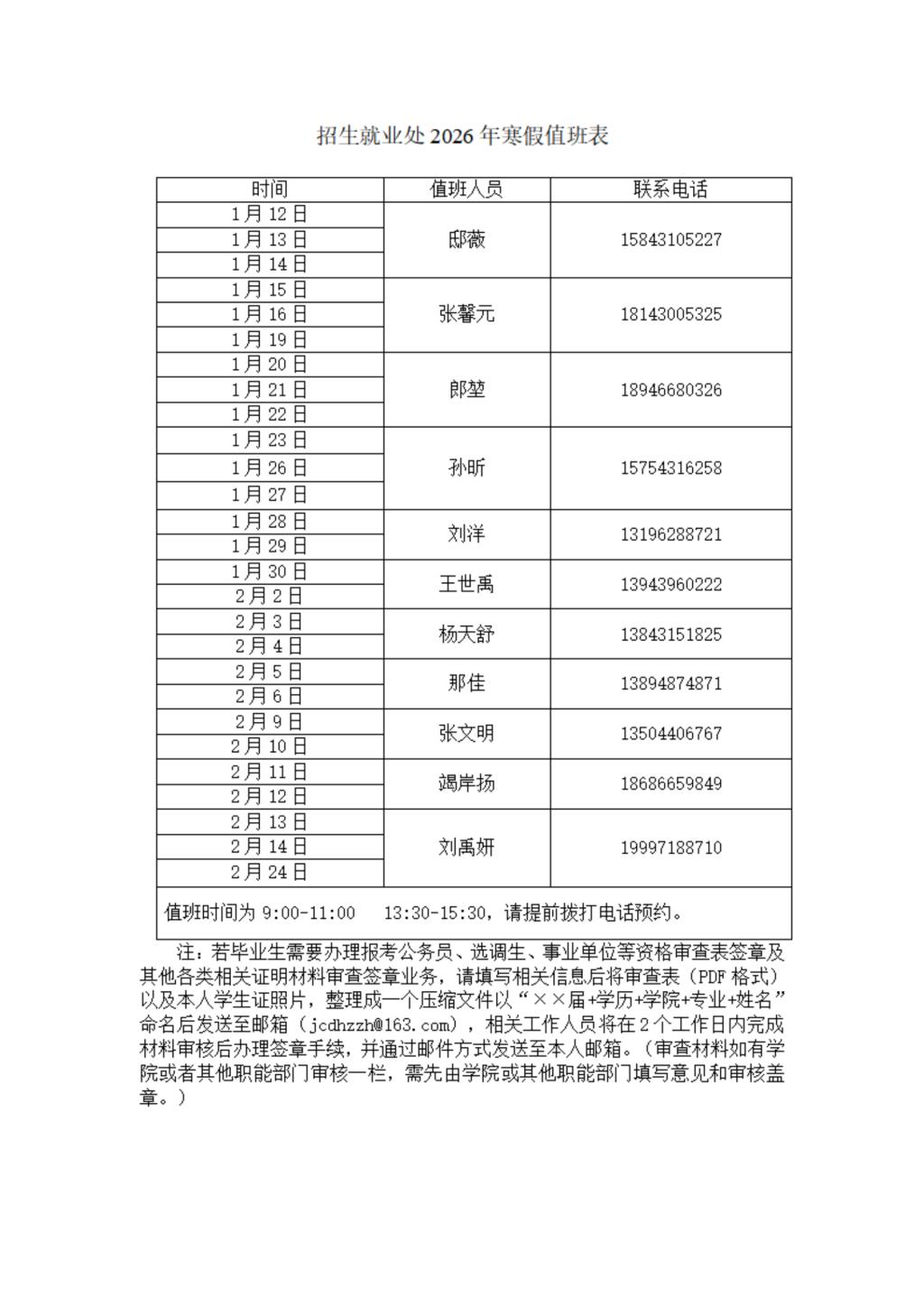 招生就业处2026年寒假值班表