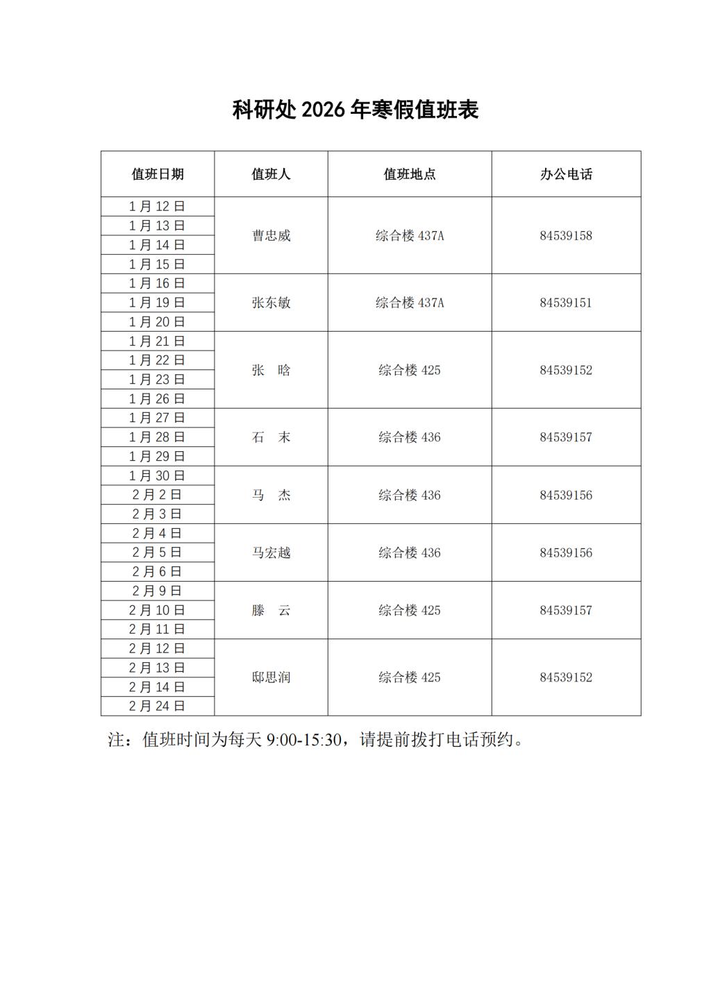 科研处2026年寒假值班表