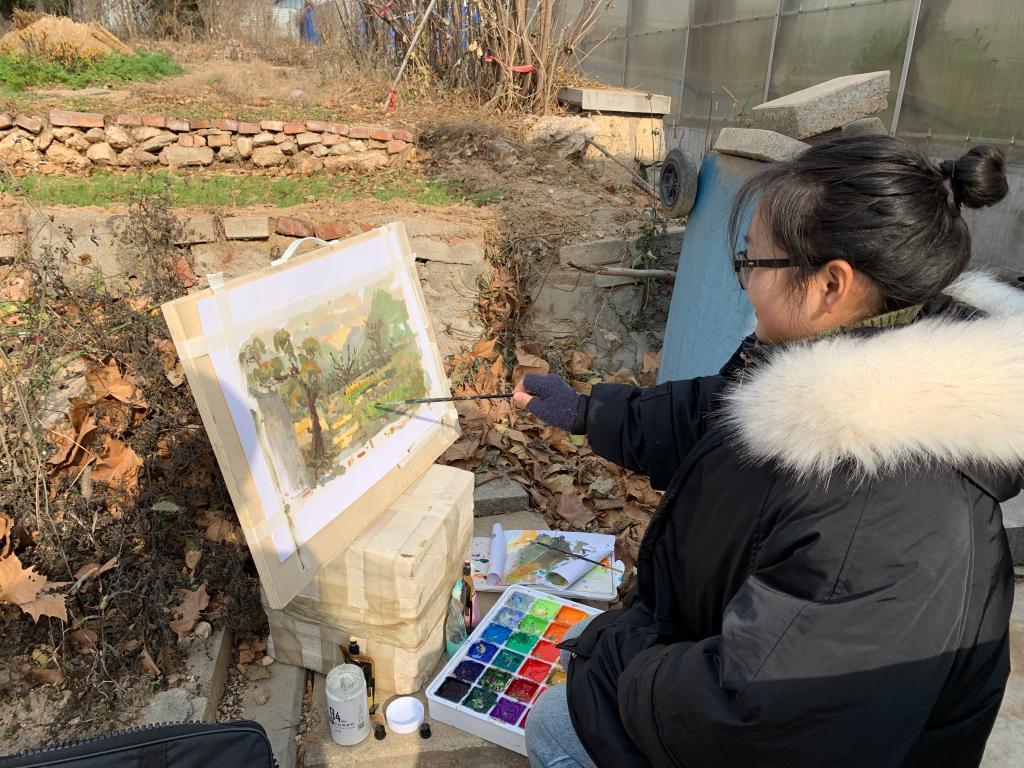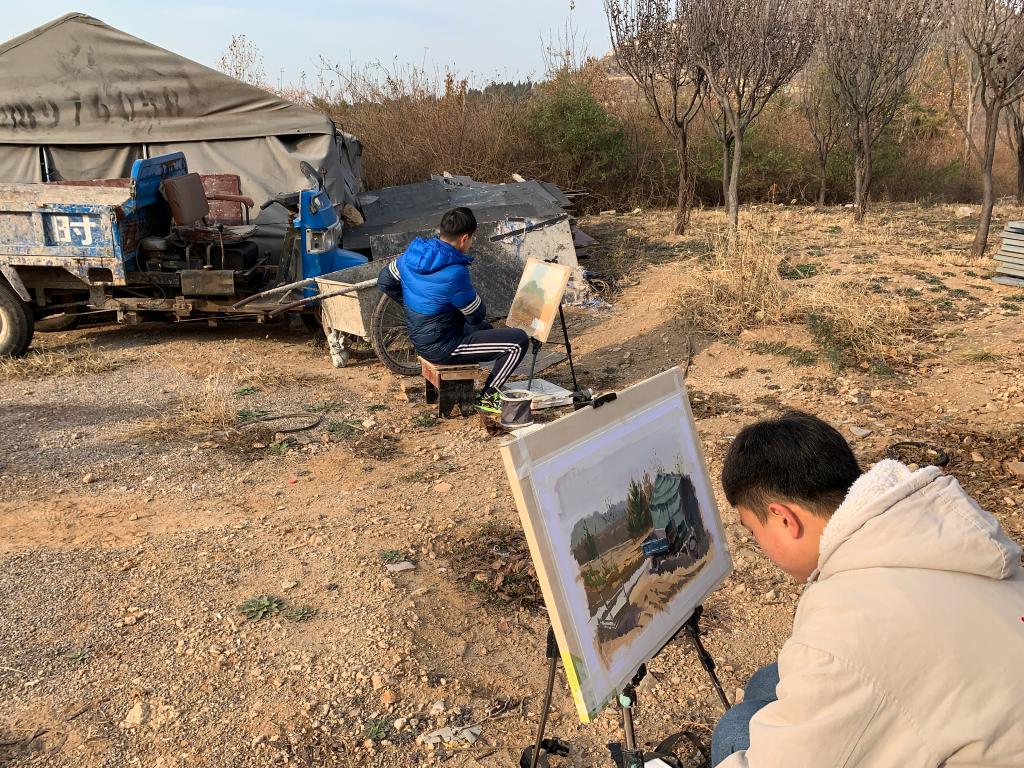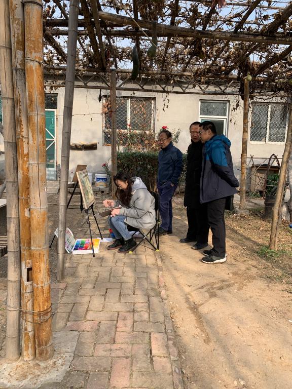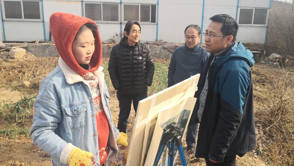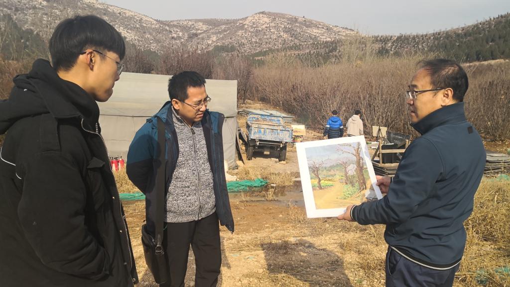 yl8cc永利官网副院长董占军教授(右一)和数字艺术与传媒教师曲衍志(左二)对学生校园写生做品了精短点评