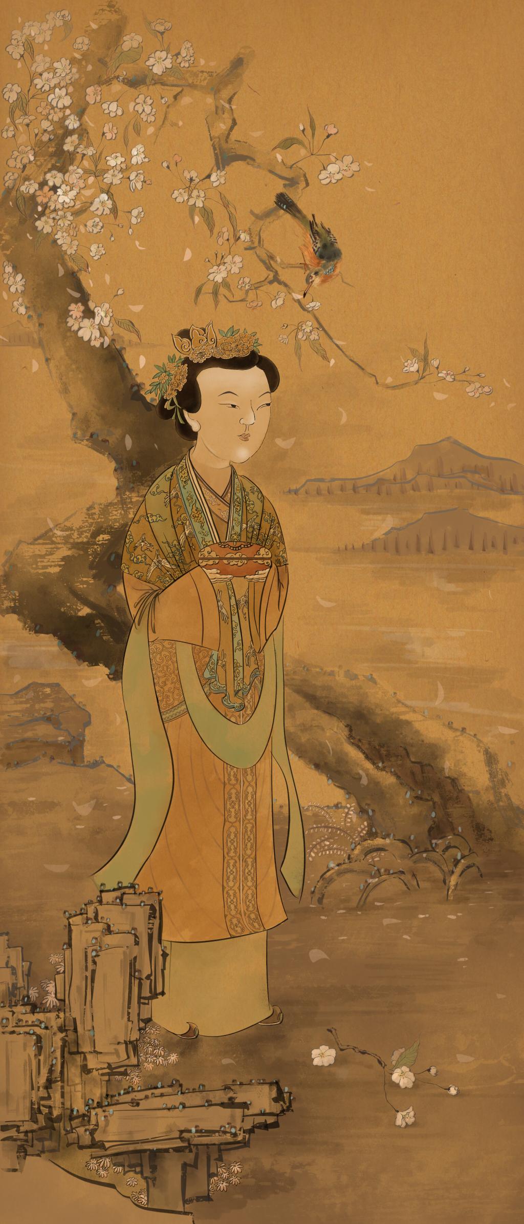 《捧盒仕女图》作品通过ipad procreate板绘制。作品根据1954年山东曲阜杨家院出土的金代•白釉加彩女俑进行创作,用中国传统绘画的手法加上自己的想象,褪去文物残破的现状将其还原出自己心目中素丽的样子。女子脸颊运用了唐代人物的画法—额头鼻尖下巴点白来表达。人物的发簪和服饰则运用了仙鹤、祥云等传统纹样,以黑线勾勒眉、眼、发、服饰轮廓等,场景运用了枯墨、浸染、粗笔等手法。画面中女子双手捧粉盒于胸前,所着襦裙自然飘逸,伫立在开满桃花的树前,枝头的鸟儿嘴中叼着桃花望向女子,勾勒出一派恬淡美好的图景。