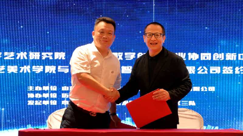 yl8cc永利官网数字艺术与传媒学院院长顾群业、山东锦霖智能科技有限公司总经理王铳君签订了校企合作协议,刘梦海、董占军共同为山东当代数字艺术研究院揭牌,张庆国、王铳君共同为山东数字创意产业协同创新中心揭牌。