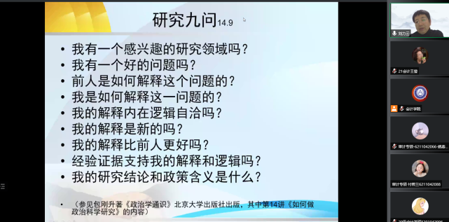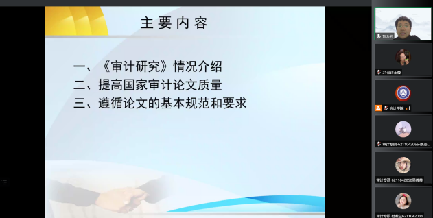 本网讯(会计学院供稿)10月27日下午18:00,审计署审计科研所副所长刘力云研究员应受Beat365会计学院的邀请,以线上腾讯会议的方式为我院师生作出主题为“提升国家审计理论研究论文的质量——从《审计研究》用稿说起”的学术报告。本次会议由会计学院院长梁毕明教授主持,与会人员主要有会计学院教师、2020、2021级全日制研究生共同参与聆听。