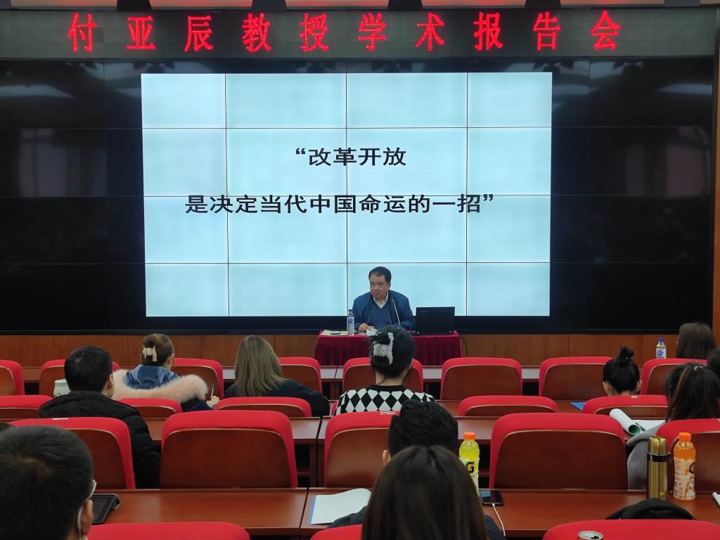 作为改革开放的亲历者、见证者、受益者,付亚辰教授以四十多年来自己的亲身经历和感受与青年学生们重温了改革开放的伟大历程,分享了改革开放的伟大成就。付亚辰教授分别从改革开放的缘起、改革开放实践的历史回眸以及继续深化改革开放三个方面,梳理了改革开放的历史背景和重大意义;回顾了改革开放伟大进程中的历史内涵和主要经验;解析了新时期改革开放的一系列战略部署,为青年学生们上了一堂生动形象的思想政治课。
