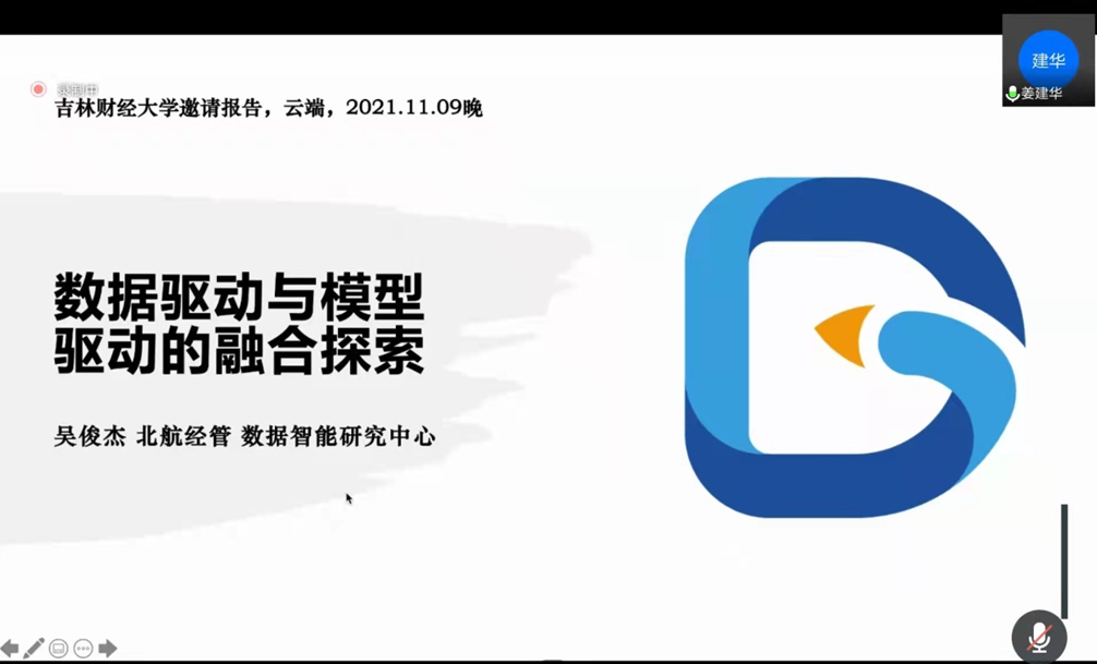 本网讯(管信学院 供稿)11月9日,管理科学与信息工程学院邀请北京航空航天大学吴俊杰教授,通过腾讯在线会议作题为《预测模型与解构模型的融合探索》的学术报告会。报告会由副院长姜建华教授主持,参会教师与学生达到67人。