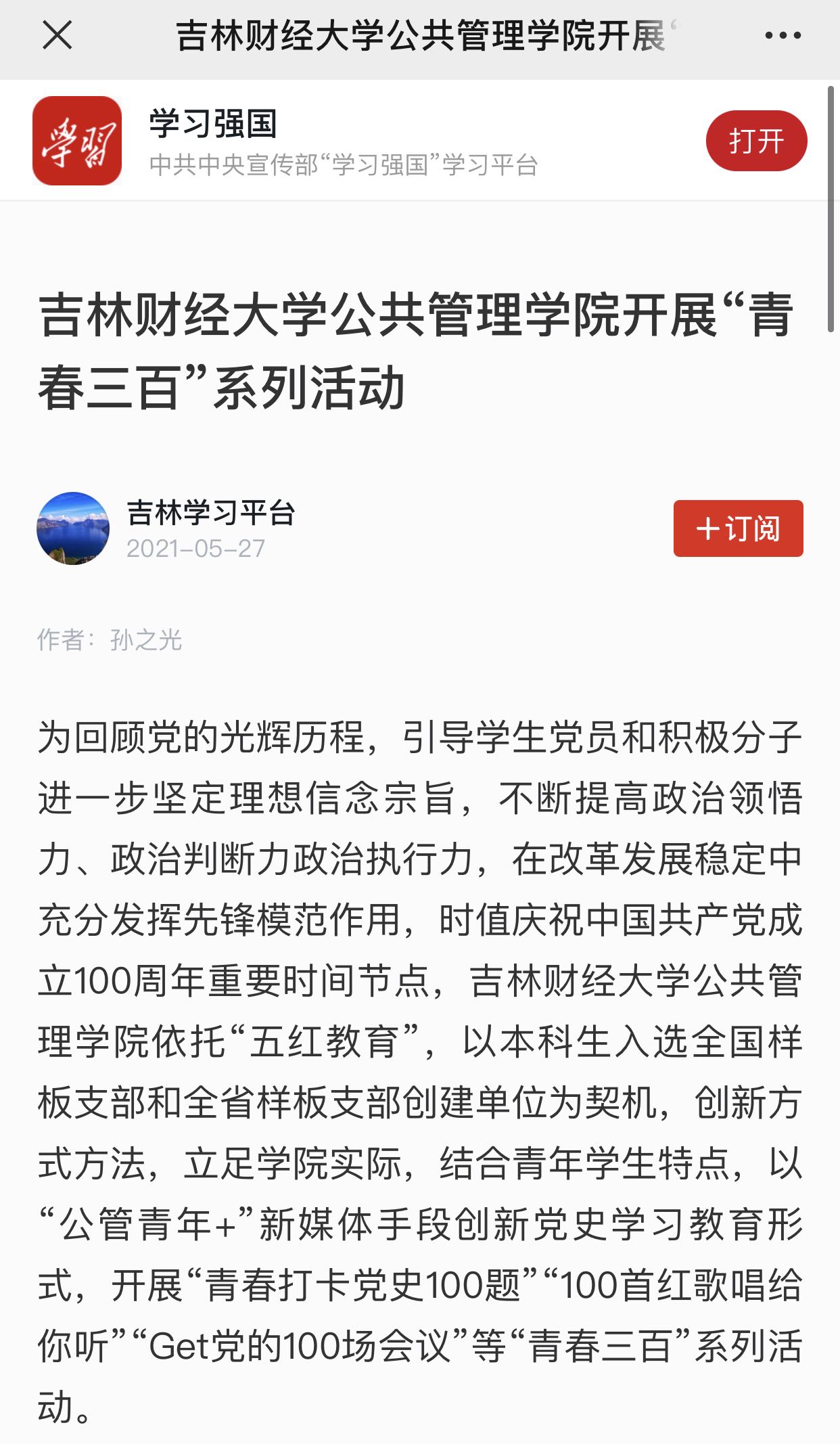 上半年,时值全社会庆祝中国共产党成立100周年之际,公共管理学院依托“五红教育”,创新方式方法,结合青年学生特点,以新媒体“公管青年+”形式开展党史学习教育,即“青春打卡党史100题”“100首红歌唱歌你听”“Get党的100场会议”的“青春三百”系列活动。同时,学生党员和积极分子录制100期党史故事微视频,引领青年学生了解党的光辉历史、感悟党的初心使命,增强青年学生对党的深厚感情。以上活动在全国高校思想政治工作网“样板支部”栏目同步更新,学习强国平台于5月份展示了“青春三百”系列活动。
