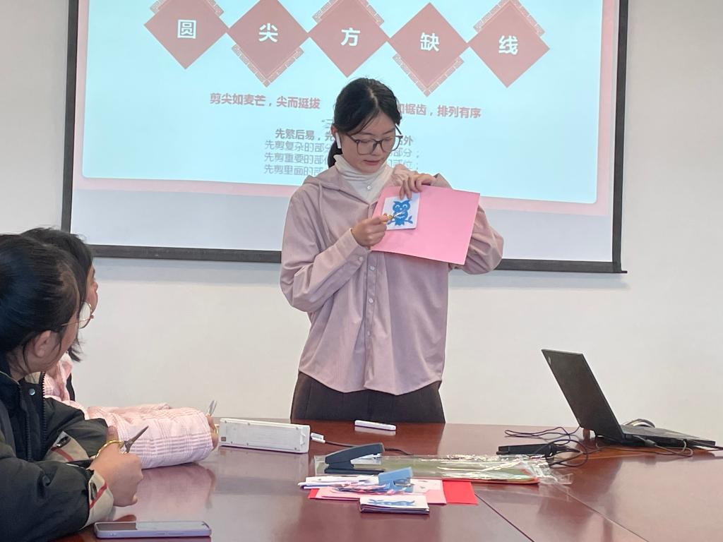 王然同学从“一把剪子一张纸”讲起,将民间剪纸艺术的来源和发展娓娓道来。通过对剪纸艺术发展历史的讲解,让在场观众了解到“剪纸”这门艺术是劳动人民为满足精神生活所创造的,因而经过代代相传流传至今。王然同学以“剪纸艺术的风格特色”、“南北风格差异及原因”、“剪纸艺术的技法”、“剪纸艺术的价值”、“剪纸技法”等向同学们详细讲述了中国剪纸的相关知识。王然同学即席挥洒,现场示范剪纸技艺;现场同学们也拿起剪刀,纷纷尝试。
