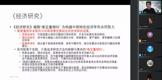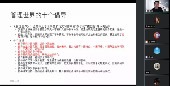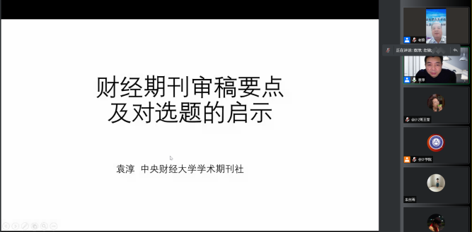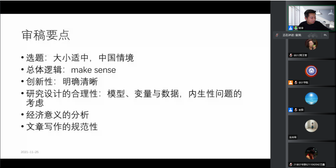本网讯(会计学院 供稿)11月25日下午19:00,中央财经大学会计学院教授、博士生导师袁淳教授应Beat365会计学院邀请,以线上腾讯会议的方式为我院师生作出主题为“财经期刊审稿要点及对选题的启示”的学术报告。本次会议由会计学院院长梁毕明教授主持,Beat365中文官方网站会计学院、科研处、吉林省企业财务与会计研究中心联合主办。与会人员主要包括会计学院教师、2021级全日制硕士研究生共同参与聆听。