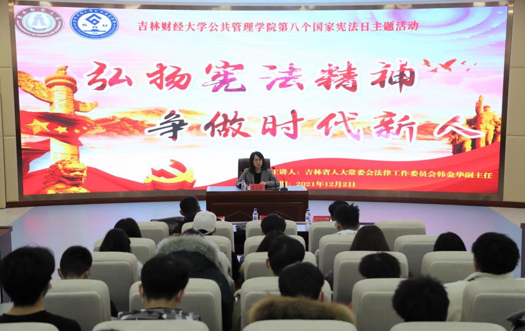 本网讯(公共管理学院 供稿)为进一步加强宪法知识宣传,引导青年学生弘扬宪法精神,维护宪法权威,保证宪法实施,做知法,懂法,守法,用法的时代新人,依托“五红教育”进红色课堂活动,12月2日,公共管理学院本科生党支部邀请我省行政立法工作专家,吉林省人大常委会法律工作委员会韩金华副主任,在1102报告厅为学院学生做题为“弘扬宪法精神 争做时代新人”普法讲座。吉林省人大机关党委副书记徐大程,公共管理学院党总支副书记孙之光参与了活动。