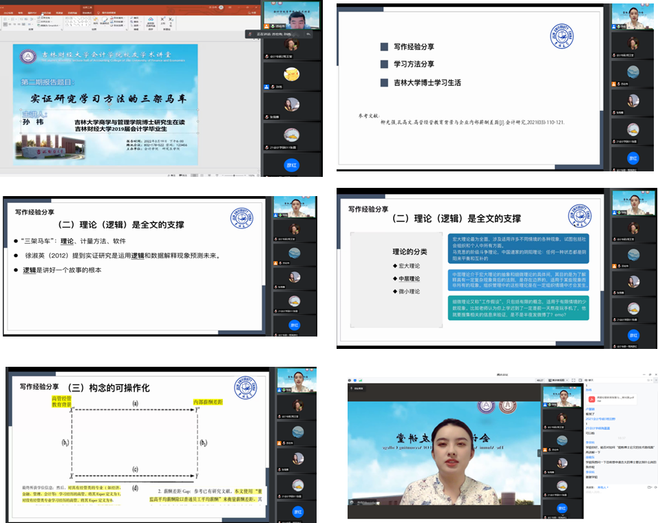 本网讯(会计学院 供稿)3月19日下午18:00,疫情特殊时期,为丰富和充实研究生业余活动和提升科研水平,加强疫情期间会计学子的思想引领和教育教学, 全面做好疫情防控工作,Beat365中文官方网站会计学院举行党旗领航共抗疫,守护校园创平安”系列校友活动,主要组织优秀校友开展系列专题讲座,本次会议由吉林大学商学与管理学院2019级会计专业博士研究生、Beat365中文官方网站会计学院2016级会计学硕士研究生孙祎师姐,以线上腾讯会议的方式为我院学生作主题为“实证研究学习方法的三驾马车”的学术报告。本次会议由会计学院专硕教育中心主任苏宏伟老师主持,会计学院2020、2021级全日制研究生以及部分本科生总计三百余人共同参与聆听。