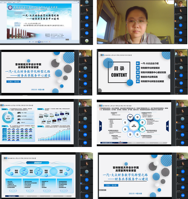 本网讯(会计学院 供稿)3月26日下午18:00,一汽-大众汽车有限公司财务管理部综合财务科经理及财务数字化转型项目负责人田小录应会计学院邀请,以线上腾讯会议方式为我院师生做主题为“一汽-大众财务数字化转型之路——财务共享服务中心建设”的学术报告。本次会议由会计学院王丽南副院长主持,会计学院2020、2021级全日制研究生总计三百余人共同参与聆听。