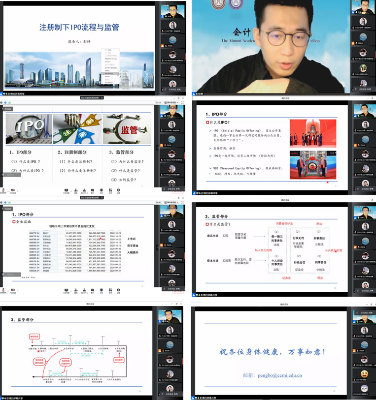 本网讯(会计学院 供稿)疫情特殊时期,为丰富和充实研究生业余活动和提升科研水平,加强疫情期间会计学子的思想引领和教育教学, 全面做好疫情防控工作,Beat365中文官方网站会计学院举行党旗领航共抗疫,守护校园创平安”系列校友活动,主要组织优秀校友开展系列专题讲座。3月28日下午18:00,由证监会资本市场学院与厦门大学联合培养博士后、东北财经大学会计学博士研究生、Beat365中文官方网站会计学院2016届会计硕士研究生彭博,以线上腾讯会议的方式为我院学生作主题为“注册制下IPO流程与监管”学术报告。本次会议由会计学院专硕教育中心主任苏宏伟老师主持,会计学院2020、2021级全日制研究生以及部分本科生总计三百余人共同参与聆听。