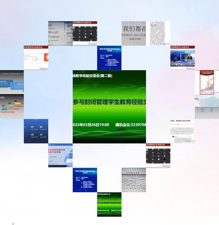本网讯(经济学院 供稿)为全面做好疫情防控期间学生管理工作,让线上思想政治教育既有质量、又有温度,将“以学生为中心”的教育理念落到实处,3月26日晚19:00,经济学院通过腾讯会议(会议号:523 970 806)举行了“抗疫你我 课堂内外”系列活动的第二场:教师参与封闭管理学生教育经验交流会。经济学院党政领导班子、全体教师参加会议。副院长刘艳龙主持会议。