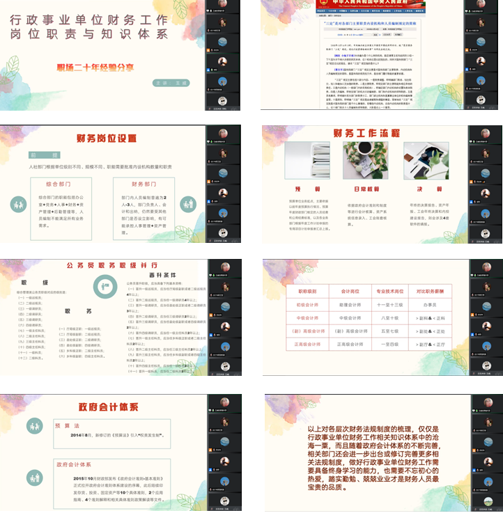 本次“行政事业单位财务工作岗位职责与知识体系”的学术报告共分为四个部分,分别是职务晋升、岗位职责、知识体系和最终总结。首先,王威老师对公务员职务职级并行进行介绍,包括综合管理类公务员职级对应的级别、职务以及公务员晋升职级应当具备的基本资格,展示了中共中央办公厅所印发的《公务员职务与职级并行规定》等相关文件,引出会计行业人才发展十四五规划、财政部“十四五”会计人才发展规划以及相应目标和措施实施;第二部分,王威老师指出何为岗位职责,主要对“三定”概念、“三定”方案进行讲解,并对财务岗位设置的前提和分类、财务工作流程、国有资产管理系统等详细展开;第三部分是知识体系,王威老师以1998年和2012年为分水岭,将行政事业单位会计体系变革分为三个阶段,讲解内容主要包括2012年行政事业单位会计体系的优缺点、政府会计体系、行政事业单位财务相关制度体系等;最后,王威老师表明做好行政事业单位财务工作需要具备终身学习的能力,踏实勤勉、兢兢业业才是财务人员最宝贵的品质。(审核人 梁毕明)