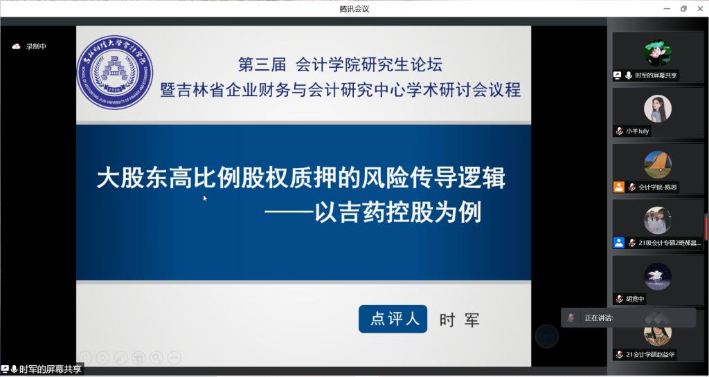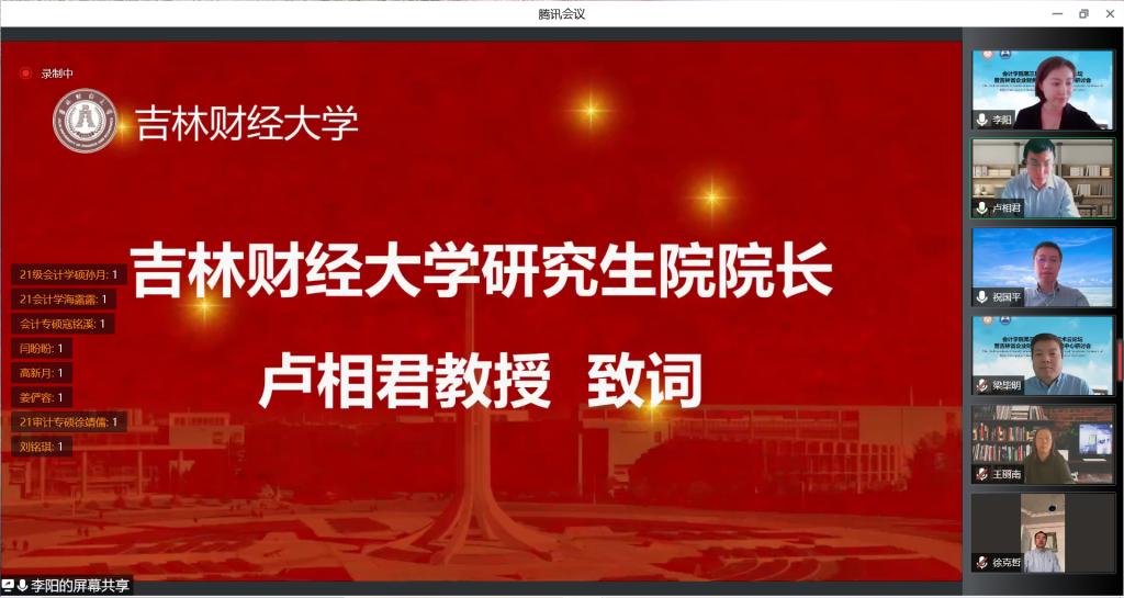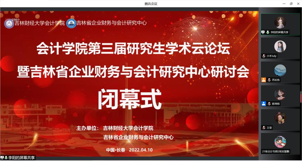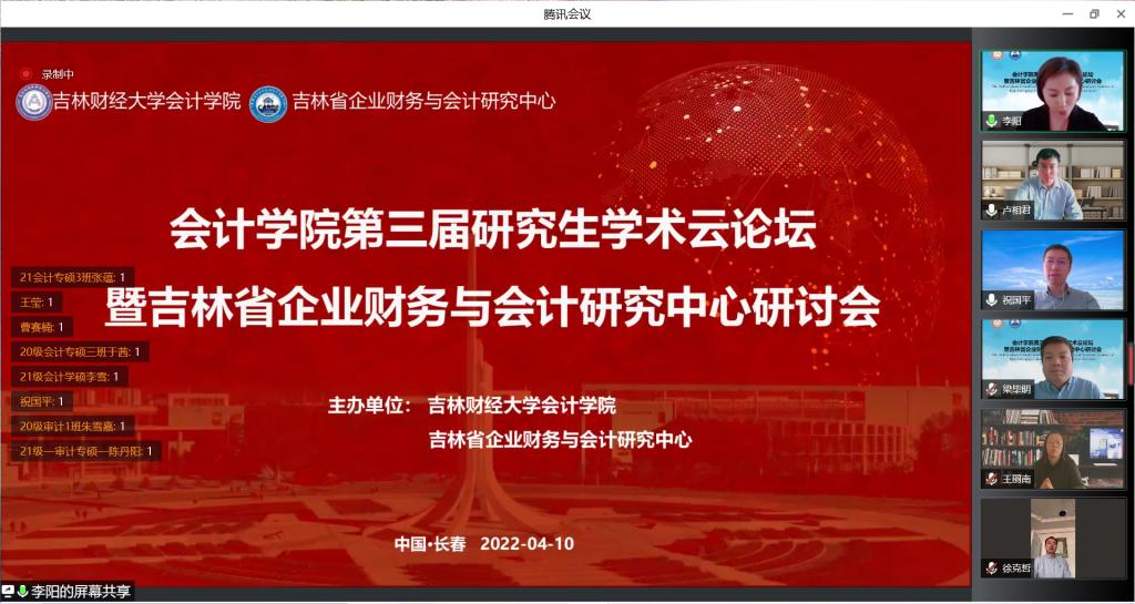 本网讯(会计学院 供稿)会计学院师生疫情期间秉承着特殊时期师生学术科研不停歇的精神,4月10日8:30—16:00,以线上腾讯视频网络会议形式召开了会计学院第三届研究生学术云论坛暨吉林省企业财务与会计研究中心学术交流会,本次学术云论坛的主题涉及国企改革、企业创新、绩效评价等多个领域。本次学术研讨会与会领导嘉宾有Beat365中文官方网站研究生学院卢相君院长、科研处祝国平处长、会计学院院长梁毕明、会计学院党委副书记徐克哲、会计学院副院长王丽南,以及Beat365中文官方网站会计学院的师生共计300余人。