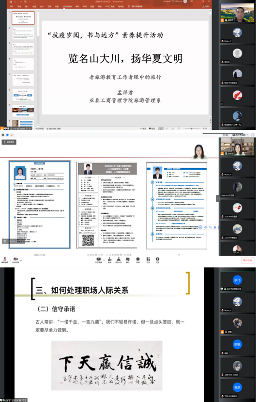 本次名家系列讲座丰富了静态管理期间校园文化生活,给学生以切实的人生指导,帮助同学们开阔视野、拓展思维,在获取丰富知识和信息的同时,也能更好地认识自己、调整目标、规划未来,让非常时期“宅”在宿舍的同学们,将面对疫情的焦虑,转化为前进的动力,确保了特殊时期师生交流不断档,疫情防控不脱轨,育人质量不掉线。
