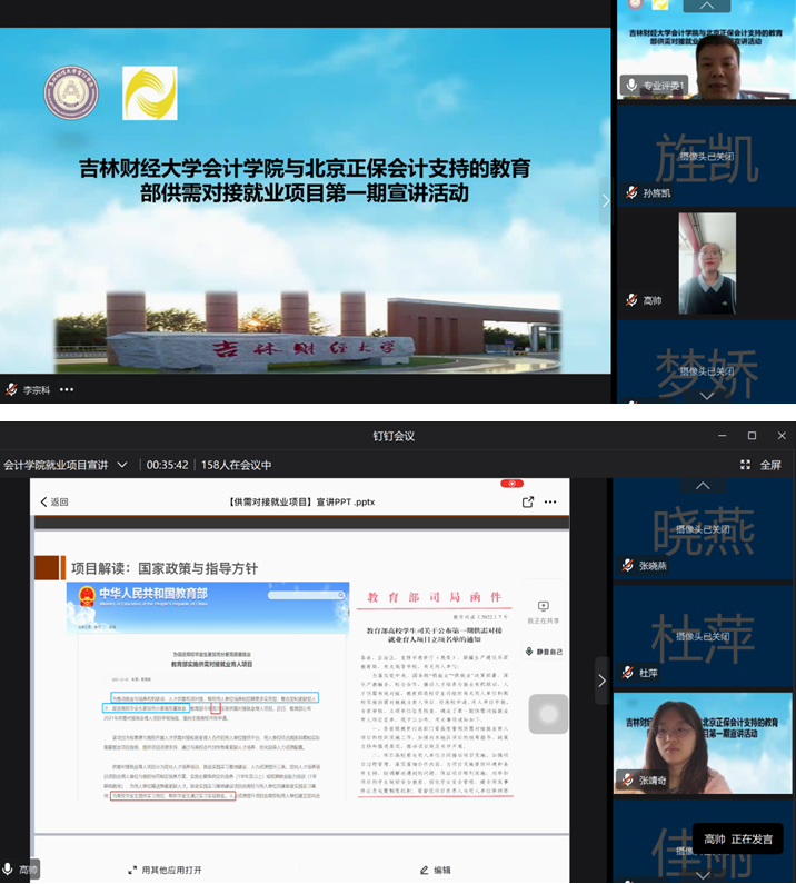 本网讯(会计学院 供稿)疫情改变了我们的生活和见面方式,却无法阻止校企合作交流的热情。为了推进教育部供需对接就业项目实施落地,会计学院与北京正保会计教育集团于5月21日上午10:00在线上召开《教育部供需对接就业项目》启动仪式暨第一期宣讲会。正保网中网供需对接就业项目负责人高帅、会计学院院长梁毕明、会计学院党委副书记徐克哲、会计学院团委书记王萌,以及150名会计学院本科和研究生同学参加了宣讲活动,会议由会计学院团委书记王萌主持。