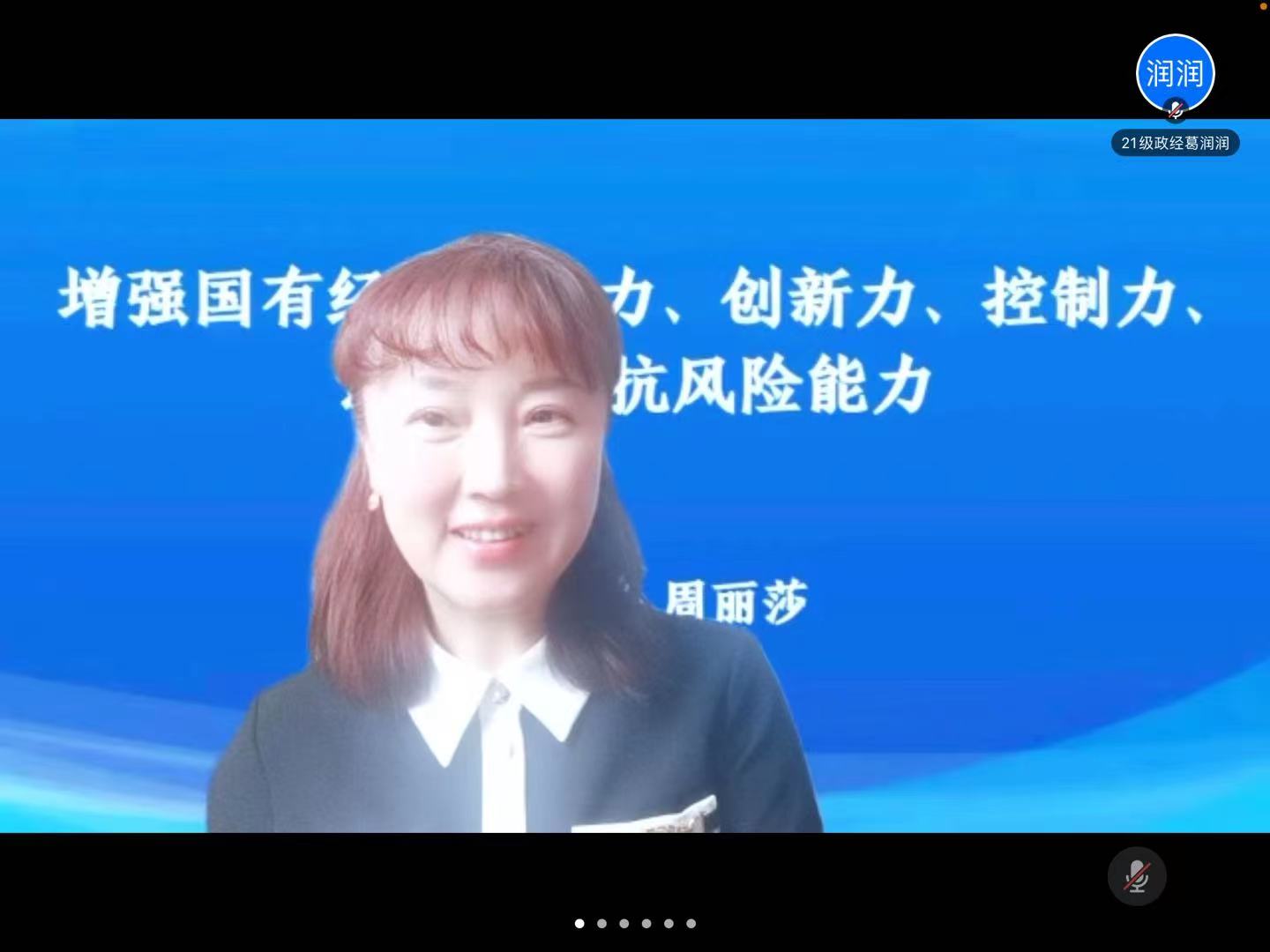 报告会上,周丽莎老师从2020年以来国家重要文件和中央会议精神关于国有企业竞争力、创新力、控制力、影响力、抗风险能力的重要论述出发,对如何多角度准确地把握国有企业发展脉搏,推动国有企业改革取得五方面实效进行了全面深入的阐述。在此基础上,周老师以国有企业应担当的社会责任为切入点,详细回顾了中国国有企业做优做强做大的光辉历史,进而联系习近平总书记在中央财经委员会第七次会议上的讲话,强调指出,应关注中国长期经济社会发展战略若干重大问题,不断推动经济优化和稳定产业链、供应链,进一步增强国有企业控制力和现代化水平。在向第二个百年奋斗目标迈进的关键时期,共同富裕是社会主义的本质要求,提高国有企业影响力,在高质量发展中促进共同富裕,使全体人民朝着共同富裕目标扎实迈进。最后,周老师强调指出,坚持问题导向,防止国有资产流失,立足机制制度创新,强化社会监督,把握中央政策和会议精神,才能推进国有企业改革,推动国有资本做强做优做大。会后,受到启发和鼓舞的与会师生与周老师进行了广泛深入的交流和探讨。