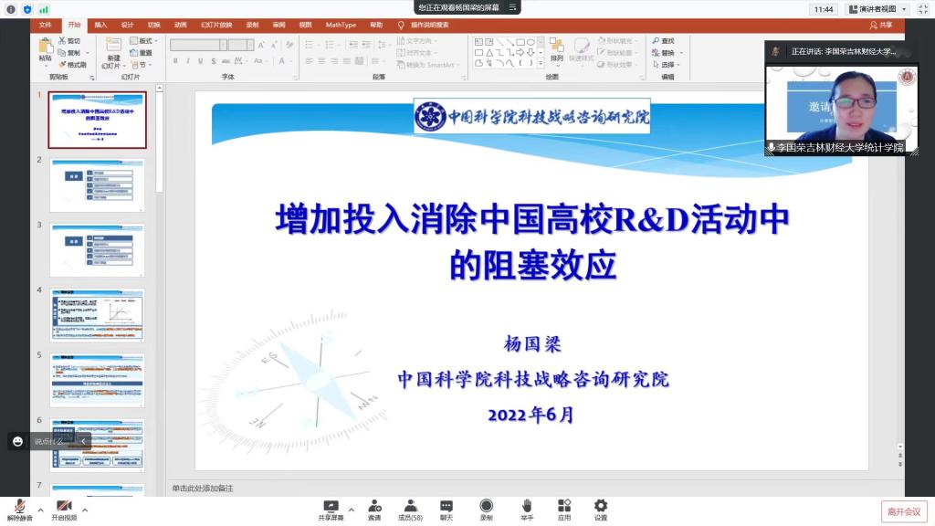 本网讯(统计学院 供稿)为了进一步拓展研究的视野,提升广大师生们的研究能力,应统计学院木仁教授邀请,中国科学院科技战略咨询研究院研究员杨国梁为我院师生作报告。报告会于6月11日晚七点,通过腾讯会议线上开展,报告主题为“增加投入消除中国高校R&D活动中的阻塞效应”。报告会由统计学院院长李国荣教授主持,统计学院教师、研究生和部分本科生参加了会议。