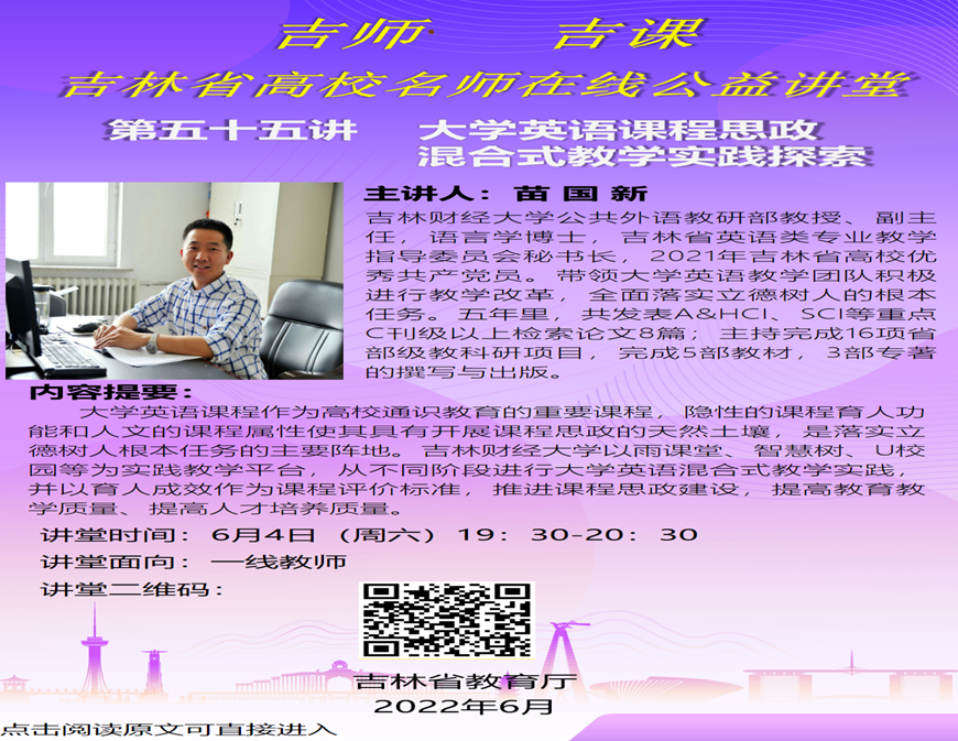Beat365公共外语教研部苗国新教授成功入选,并于6月4日晚在“吉师吉课”讲堂作了“大学英语课程思政混合式教学实践探索”的主题讲座。