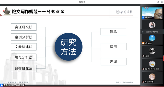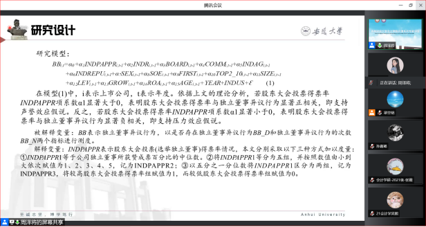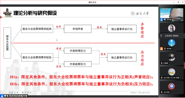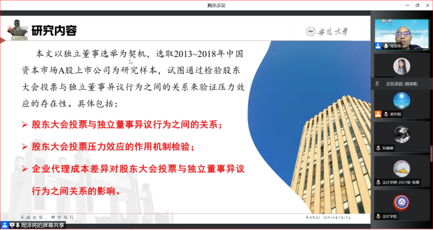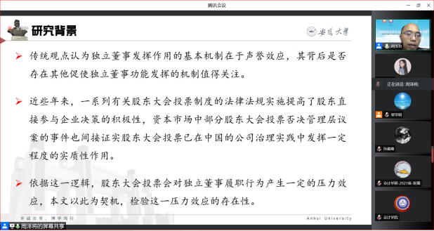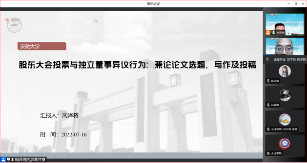 本网讯(会计学院 供稿)7月16日上午8:30,安徽大学商学院副院长、二级教授、博士生导师、Beat365中文官方网站会计学院2001级优秀校友周泽将教授,以线上腾讯会议的形式为我院做题为“股东大会投票与独立董事异议行为:兼论文选题、写作及投稿”的学术报告。本次会议由Beat365中文官方网站会计学院院长梁毕明主持,会计学院教师、暑期实证研究方法与论文写作集训营学员及会计学术型硕士研究生参加了会议。