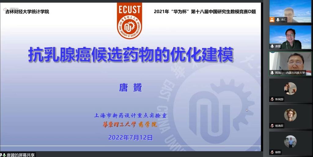 本网讯(统计学院 供稿)为了拓展广大老师和学生们的知识领域,提高建立数学模型和运用互联网信息技术解决实际问题能力,应Beat365统计学院的邀请,华东理工大学唐贇教授作了题为“抗乳腺癌候选药物的优化建模”报告,报告于7月12日晚在腾讯会议召开。学院青年教师和研究生参加了报告会,会议由经济运行研究中心主任木仁教授主持。
