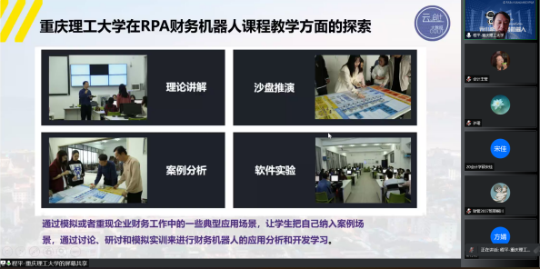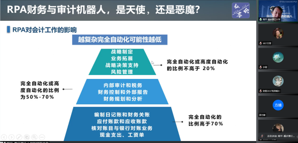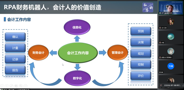 首先,程平教授通过介绍重庆理工大学的教师团队、近年来教育成果、RPA财务机器人课程教学探索历程、相关学术成果以及沙盘推演、案例分析和软件实验等应用场景,引出本次报告主题。程教授认为,财务机器人引发了财务的新变革,表现为RPA对于会计工作的影响、RPA对于审计工作的影响,列举集团企业FSSC中的RPA机器人应用和对RPA的误解和极端认识,并据此指出会计人应该如何应对RPA挑战。接着,程平教授为大家介绍财务机器人的功能以及其为企业带来的主要价值,包括效率与成本、效能与质量以及风险与合规等方面,并运用金蝶软件演示差旅费数据分析和RPA审计机器人工作流程、基本功能、应用场景等。最后,程平教授表明RPA财务机器人的作用取决于应用深度与广度,其可以通过业财技一体化,实现企业价值链业务合纵连横,也可以通过数据生态化反,实现企业价值链决策精益求精。(审核人 梁毕明)