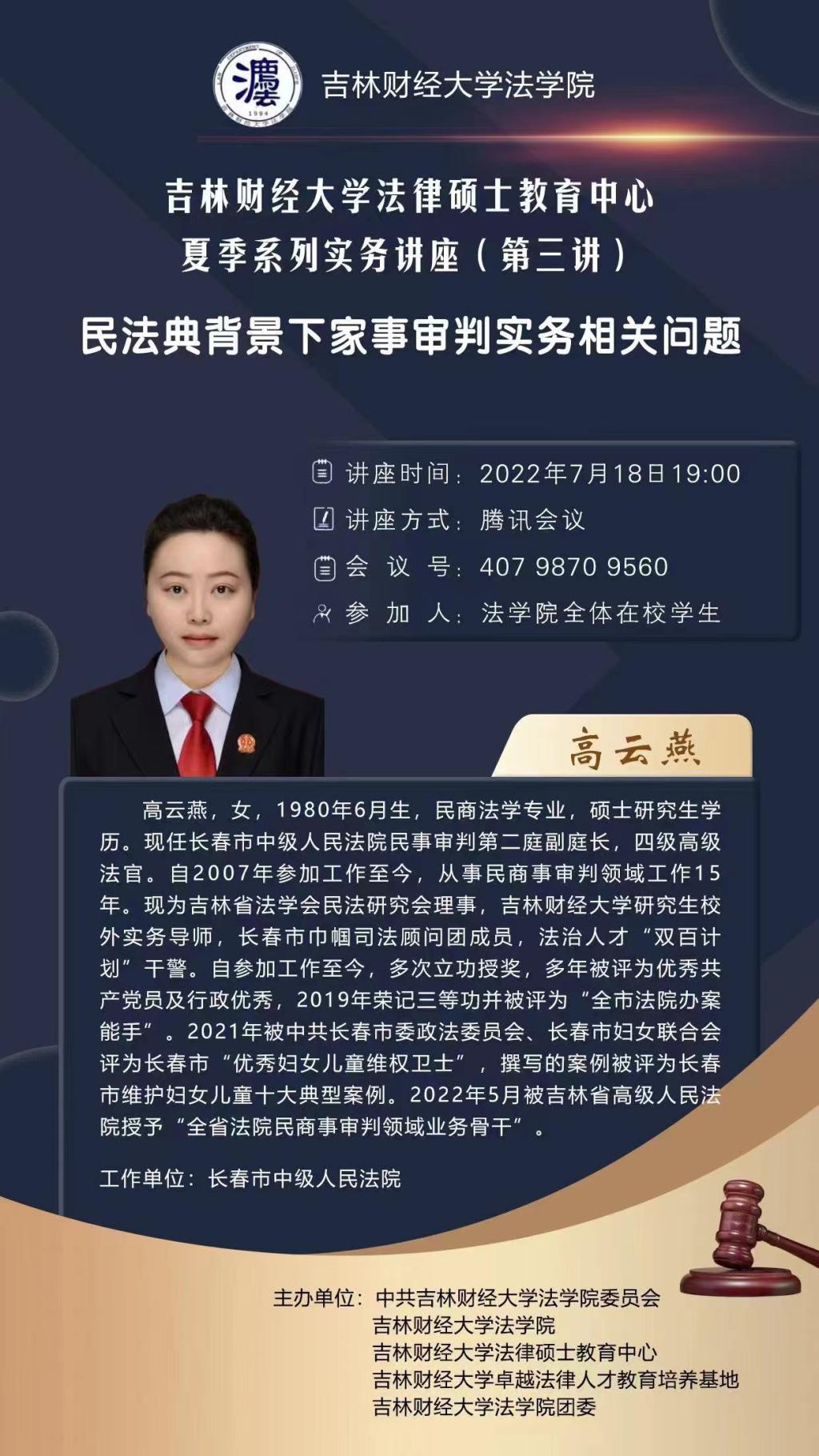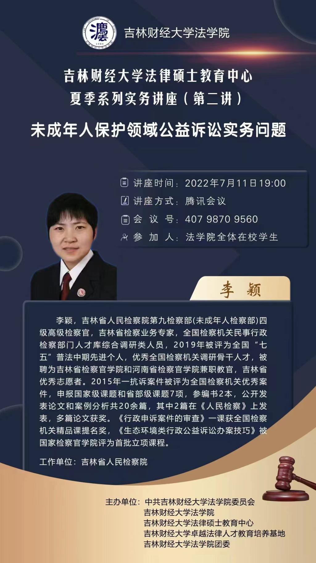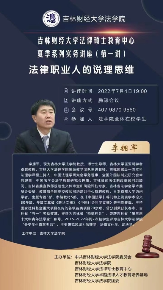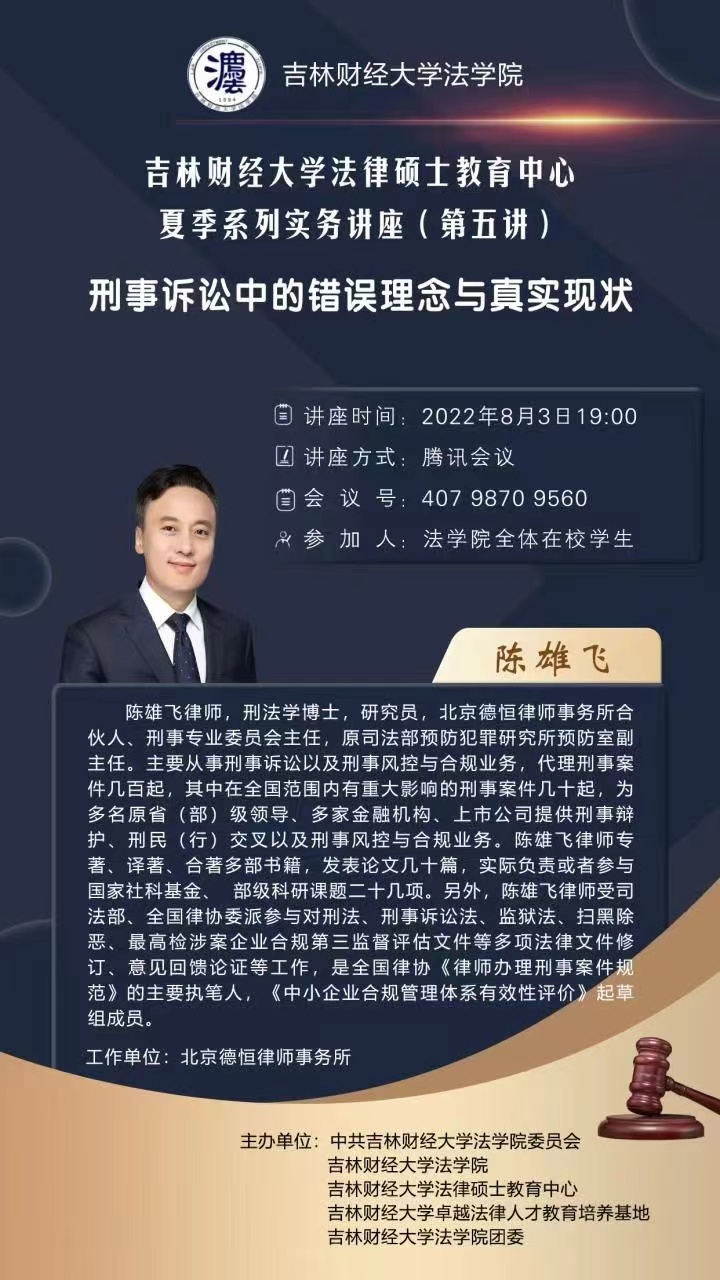 本次系列讲座共设5场,主讲人依次为吉林大学法学院教授、博士生导师李拥军,吉林省人民检察院第九检察部四级高级检察官李颖,长春市中级人民法院民事审判庭第二庭副庭长高云燕,长春市双阳区人民法院副院长王忠旭,北京德恒律师事务所合伙人陈雄飞。自7月4日起每周一次晚7点在线为学生作专题讲座。系列讲座视角多元,涵盖学者、法官、检察官、律师各个角度,涉及民事、刑事等多个法律问题。以视角多元、内容丰富为特征的系列讲座信息一经发布,在学生中引起了广泛关注。