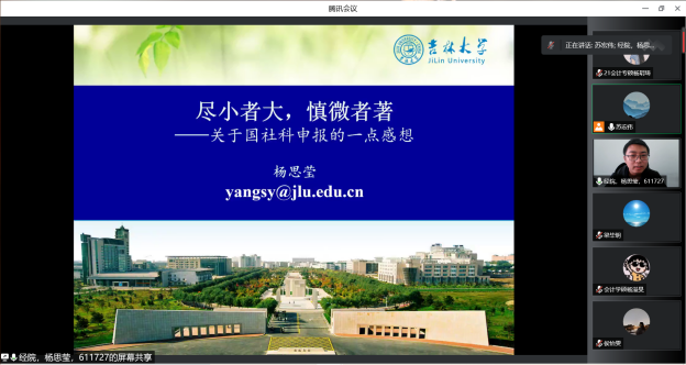 本网讯(会计学院 供稿)9月21日下午13:30,会计学院邀请吉林大学经济学院杨思莹副教授,以线上腾讯会议的方式为我院师生做主题为“尽小者大,慎微者著——国社科申报的心得、感想”的学术报告。报告会由会计专硕教育中心主任苏宏伟主持,学院部分教师与2020、2021级全日制学术研究生参加了辅导。