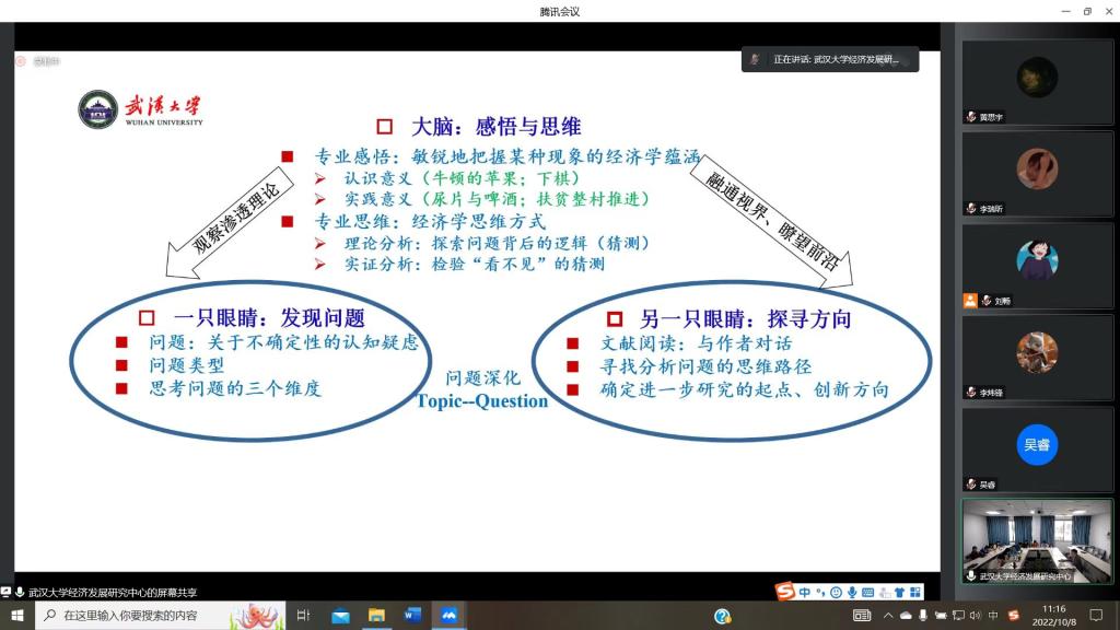 报告会上,叶初升教授深刻又不失风趣地分析了写论文的误区、好论文的形成以及论文的本质。叶教授认为,学术论文不是技术的堆砌,而是灵魂的展现。没有故事,或者讲述那些无趣的故事和无根的故事的论文都不是好论文。叶教授指出,好的学术研究必须依赖两只眼睛,一只用来发现问题,另一只用来探寻方向。在发现问题时,要有怀疑精神,同时也要深入思考问题的本质,即“疑于现象,虑之本质”;在探寻方向时,则要深入挖掘已有文献,以问题逻辑或认识逻辑为思维路径,在文献中探寻问题打开的方向。最终,“两只眼睛”打通,形成问题的深化。最后,叶教授提出,论文本质上是一种学术叙事,是使用学理的方式解释和理解世界。在交流环节,叶教授依据自身经验,耐心解答了统计学院师生在论文写作过程中的疑惑。