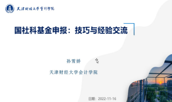 本网讯(会计学院 供稿)11月16日,会计学院邀请天津财经大学会计学院孙雪娇教授,为学院师生作“国社科基金申报:技巧与经验交流”的主题线上学术报告。报告会由学院会计系主任周园主持,会计学院教师、2021级、2022级全日制学术研究生参加了辅导会。