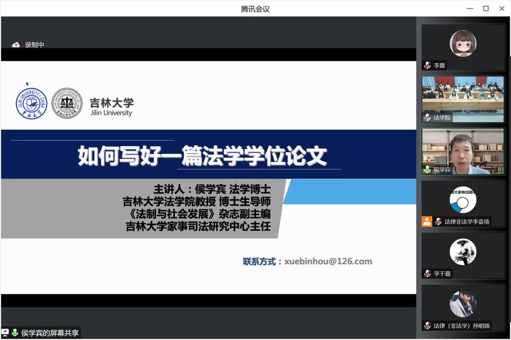 本网讯(法学院 供稿)为深入学习贯彻党的二十大精神,全面贯彻落实全国教育大会、全国研究生教育会议精神,促进研究生全面发展,切实提升研究生培养质量,加快新时代研究生教育改革,提升研究生论文写作水平,帮助研究生更好地学习和掌握论文写作的方法,法学院、法律硕士教育中心开展了2022年度研究生论文写作能力提升系列讲座。系列讲座共3讲,分别邀请了吉林大学法学院博士生导师侯学宾教授、吉林大学法学院博士生导师田洪鋆教授,西北政法大学刑事法学院副院长刘仁琦副教授为研究生同学分别进行了题为“如何写好一篇法学学位论文”、“研究生论文写作的过程控制”和“素材与方法:研究生案例论文写作能力与技巧”的讲座。系列讲座由法学院副院长王开宇主持,法学院部分教师、研究生共计300余人次参加了讲座。