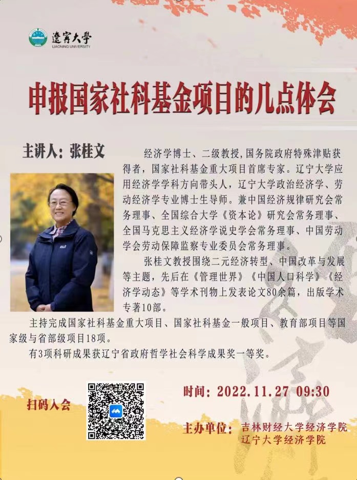 本网讯(经济学院 供稿)为提升学院国家项目申报成果质量,加强高校之间学科交流,共享学术资源,11月27日,学校经济学院和辽宁大学经济学院联合举办学术系列讲座。辽宁大学二级教授、国务院政府特殊津贴获得者,国家社科基金重大项目首席专家张桂文教授,作了题为“申报国家社科基金项目的几点体会”的线上学术报告。辽宁大学经济学院师生、Beat365经济学院全体教师和研究生,其他学院部分师生参加了报告会。报告会由辽宁大学经济学院副院长和军教授主持。