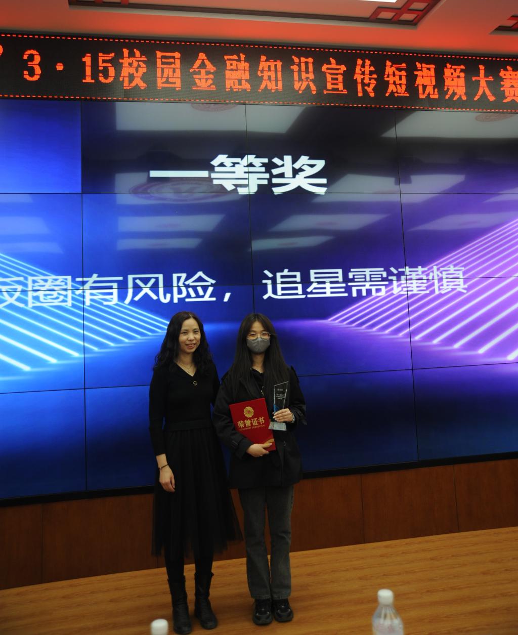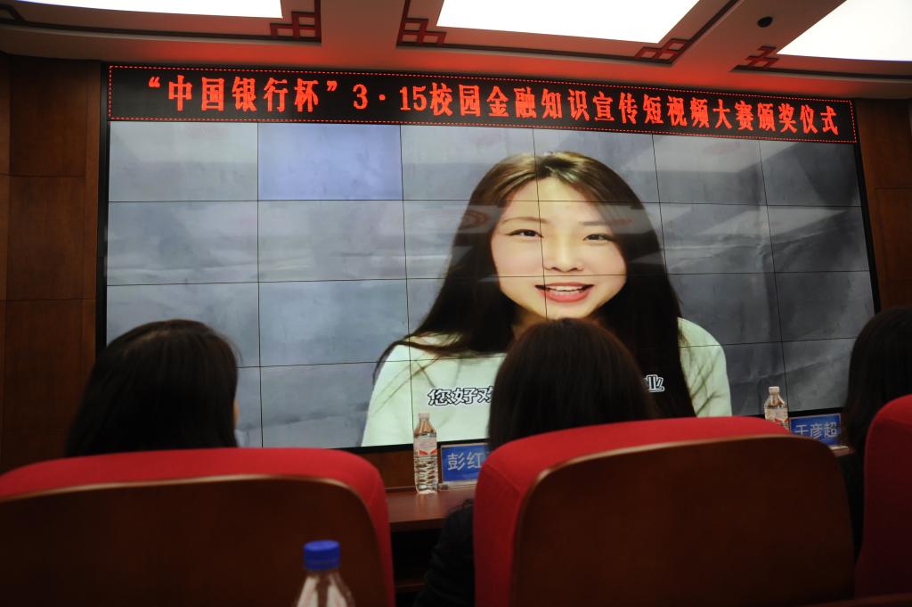 王丽颖和孟爽在颁奖仪式上致辞,对本次活动给予了高度评价,对学生参赛积极性和参赛成果高度肯定,对双方的进一步合作确定了方向。本次大赛包括作品征集、投票评选和颁奖仪式三个环节,在前期的作品征集环节中,学院共有167名学生组成了多支参赛小组,通过认真的学习和对金融消费者权益保护知识的讨论研究,提交了32个内容新颖详实、各具创意的短视频作品。中国银行长春朝阳支行和金融学院共同组成了大赛评审团,评选出特等奖一项、一等奖一项、二等奖三项、三等奖五项、优秀奖十项、最佳人气奖和最佳创意奖各一项。活动中,银行工作人员及学院老师面向同学进行了金融知识宣讲和有奖知识问答。